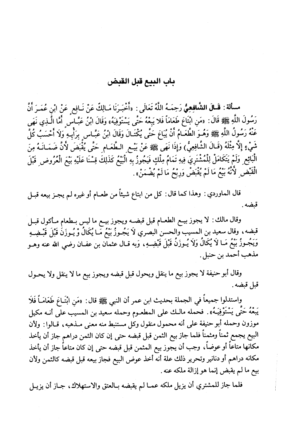 قَالَ الشَّافِعِيُّ رَحِمَهُ اللَّهُ تَعَالَى: " أَخْبَرَنَا مَالِكٌ عَنْ نَافِعٍ عَنِ ابْنِ عُمَرَ أَنَّ رَسُولَ اللَّهِ - صَلَّى اللَّهُ عَلَيْهِ وَسَلَّم َ - قَالَ: " مَنِ ابْتَاعَ طَعَامًا فَلَا يَبِعْهُ حَتَّى يَسْتَوْفِيَهُ " وَقَالَ ابْنُ عَبَّاسٍ أَمَّا الَّذِي نَهَى عَنْهُ رَسُولُ اللَّهِ - صَلَّى اللَّهُ عَلَيْهِ وَسَلَّم َ - وَهُوَ الطَّعَامُ أَنْ يُبَاعَ حَتَّى يُكْتَالَ وَقَالَ ابْنُ عَبَّاسٍ بِرَأْيِهِ وَلَا أَحْسَبُ كُلَّ شَيْءٍ إِلَّا مِثْلَهُ (قَالَ الشَّافِعِيُّ) وَإِذَا نَهَى - صَلَّى اللَّهُ عَلَيْهِ وَسَلَّم َ - عَنْ بَيْعِ الطَّعَامِ حَتَّى يُقْبَضَ لِأَنَّ ضَمَانَهُ مِنَ الْبَائِعِ وَلَمْ يَتَكَامَلْ لِلْمُشْتَرِيَ فِيهِ تَمَامُ مِلْكٍ فَيَجُوزُ بِهِ الْبَيْعُ كَذَلِكَ قِسْنَا عَلَيْهِ بَيْعَ الْعُرُوضِ قَبْلَ الْقَبْضِ لِأَنَّهُ بَيْعُ مَا لَمْ يُقْبَضْ وَرِبْحُ مَا لَمْ يُضْمَنْ ".