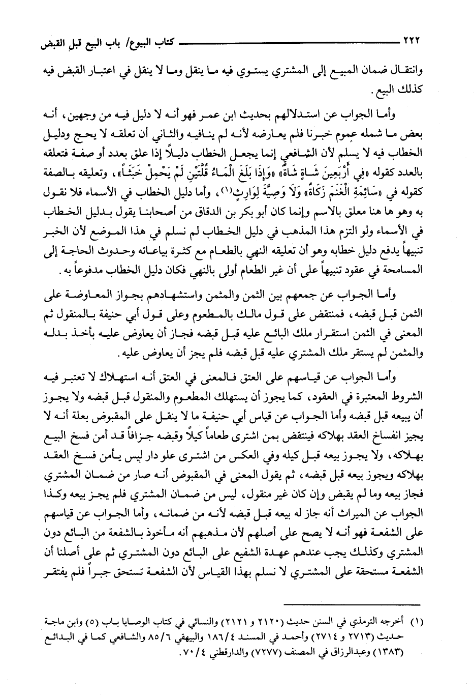 وَأَمَّا الْجَوَابُ عَنْ قِيَاسِهِمْ عَلَى الْعِتْقِ فَالْمَعْنَى فِي الْعِتْقِ أَنَّهُ اسْتِهْلَاكٌ لَا تُعْتَبَرُ فِيهِ الشُّرُوطُ الْمُعْتَبَرَةُ فِي الْعُقُودِ، كَمَا يَجُوزُ أَنْ يَسْتَهْلِكَ الْمَطْعُومَ وَالْمَنْقُولَ قَبْلَ قَبْضِهِ وَلَا يَجُوزُ أَنْ يَبِيعَهُ قَبْلَ قَبْضِهِ وَأَمَّا الْجَوَابُ عَنْ قِيَاسِ أبي حنيفة مَا لَا يُنْقَلُ عَلَى الْمَقْبُوضِ بِعِلَّةٍ أَنَّهُ لَا يُجِيزُ انْفِسَاخَ الْعَقْدِ بِهَلَاكِهِ فَيَنْتَقِضُ بِمَنِ اشْتَرَى طَعَامًا كَيْلًا وَقَبَضَهُ جُزَافًا قَدْ أَمِنَ فَسْخَ الْبَيْعِ بِهَلَاكِهِ، وَلَا يَجُوزُ بَيْعُهُ قَبْلَ كَيْلِهِ وَفِي الْعَكْسِ مَنِ اشْتَرَى عُلُوَّ دَارٍ لَيْسَ يَأْمَنُ فَسْخَ الْعَقْدِ بِهَلَاكِهِ وَيَجُوزُ بَيْعُهُ قَبْلَ قَبْضِهِ، ثُمَّ يَقُولُ الْمَعْنَى فِي الْمَقْبُوضِ أَنَّهُ صَارَ مِنْ ضَمَانِ الْمُشْتَرِي فَجَازَ بَيْعُهُ وَمَا لَمْ يَقْبِضْ وَإِنْ كَانَ غَيْرَ مَنْقُولٍ، لَيْسَ مِنْ ضَمَانِ الْمُشْتَرِي فَلَمْ يَجُزْ بَيْعُهُ وَكَذَا الْجَوَابُ عَنِ الْمِيرَاثِ أَنَّهُ جَازَ لَهُ بَيْعُهُ قَبْلَ قَبْضِهِ لِأَنَّهُ مِنْ ضَمَانِهِ، وَأَمَّا الْجَوَابُ عَنْ قِيَاسِهِمْ عَلَى الشُّفْعَةِ فَهُوَ أَنَّهُ لَا يَصِحُّ عَلَى أَصْلِهِمْ لِأَنَّ مَذْهَبَهُمْ أَنَّهُ مَأْخُوذٌ بِالشُّفْعَةِ مِنَ الْبَائِعِ دُونَ الْمُشْتَرِي وَكَذَلِكَ يَجِبُ عِنْدَهُمْ عُهْدَةُ الشَّفِيعِ عَلَى الْبَائِعِ دُونَ الْمُشْتَرِي ثُمَّ عَلَى أَصْلِنَا أَنَّ الشُّفْعَةَ مُسْتَحَقَّةٌ عَلَى الْمُشْتَرِي لَا نُسَلِّمُ بِهَذَا الْقِيَاسِ لِأَنَّ الشُّفْعَةَ تَسْتَحِقُّ جَبْرًا فلم يفتقر