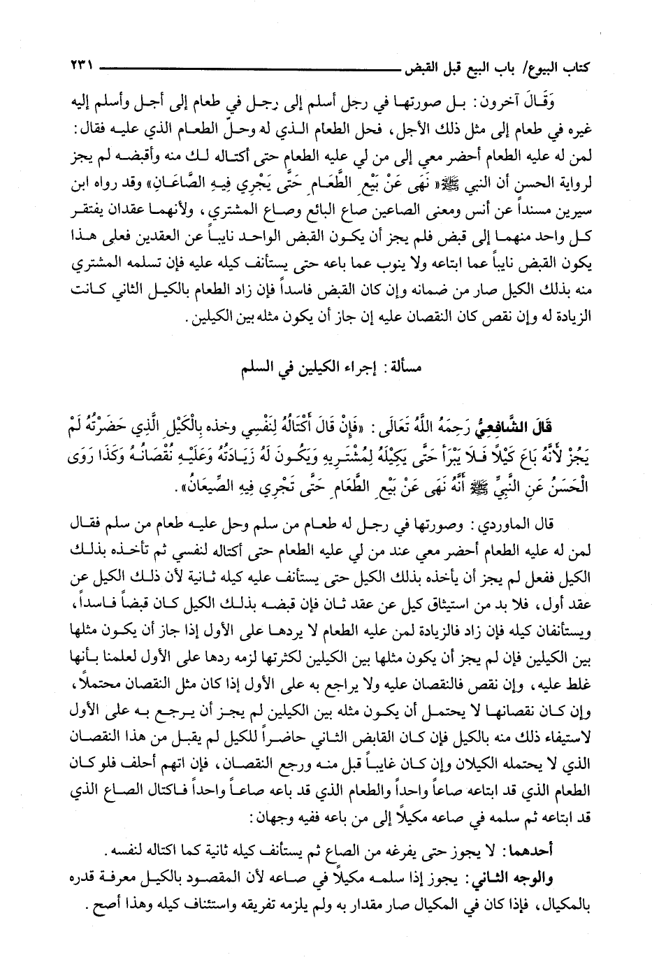 وَقَالَ آخَرُونَ: بَلْ صُورَتُهَا فِي رَجُلٍ أَسْلَمَ إِلَى رَجُلٍ فِي طَعَامٍ إِلَى أَجَلٍ وَأَسْلَمَ إِلَيْهِ غَيْرَهُ فِي طَعَامٍ إِلَى مِثْلِ ذَلِكَ الْأَجَلِ، فَحَلَّ الطَّعَامُ الَّذِي لَهُ وَحَلَّ الطَّعَامُ الَّذِي عَلَيْهِ فَقَالَ: لِمَنْ لَهُ عَلَيْهِ الطَّعَامُ احْضَرْ مَعِي إِلَى مَنْ لِي عَلَيْهِ الطَّعَامُ حَتَّى أَكْتَالَهُ لَكَ مِنْهُ وَأَقْبِضَهُ لَمْ يَجُزْ لِرِوَايَةِ الْحَسَنِ أَنَّ النَّبِيَّ - صَلَّى اللَّهُ عَلَيْهِ وَسَلَّم َ -: " نهى عن بيع الطعام حتى يجري فيه الصَّاعَانِ " وَقَدْ رَوَاهُ ابْنُ سِيرِينَ مُسْنَدًا عَنْ أَنَسٍ وَمَعْنَى الصَّاعَيْنِ صَاعُ الْبَائِعِ وَصَاعُ الْمُشْتَرِي، وَلِأَنَّهُمَا عَقْدَانِ يَفْتَقِرُ كُلُّ وَاحِدٍ مِنْهُمَا إِلَى قَبْضٍ فَلَمْ يَجُزْ أَنْ يَكُونَ الْقَبْضُ الْوَاحِدُ نايبا عن العقدين فعلى هذا يكون القبض نايبا عَمَّا ابْتَاعَهُ وَلَا يَنُوبُ عَمَّا بَاعَهُ حَتَّى يَسْتَأْنِفَ كَيْلَهُ عَلَيْهِ فَإِنْ تَسَلَّمَهُ الْمُشْتَرِي مِنْهُ بِذَلِكَ الْكَيْلِ صَارَ مِنْ ضَمَانِهِ وَإِنْ كَانَ الْقَبْضُ فَاسِدًا فَإِنْ زَادَ الطَّعَامُ بِالْكَيْلِ الثَّانِي كَانَتِ الزِّيَادَةُ لَهُ وَإِنْ نَقَصَ كَانَ النُّقْصَانُ عَلَيْهِ إِنْ جَازَ أَنْ يَكُونَ مِثْلَهُ بَيْنَ الكيلين.