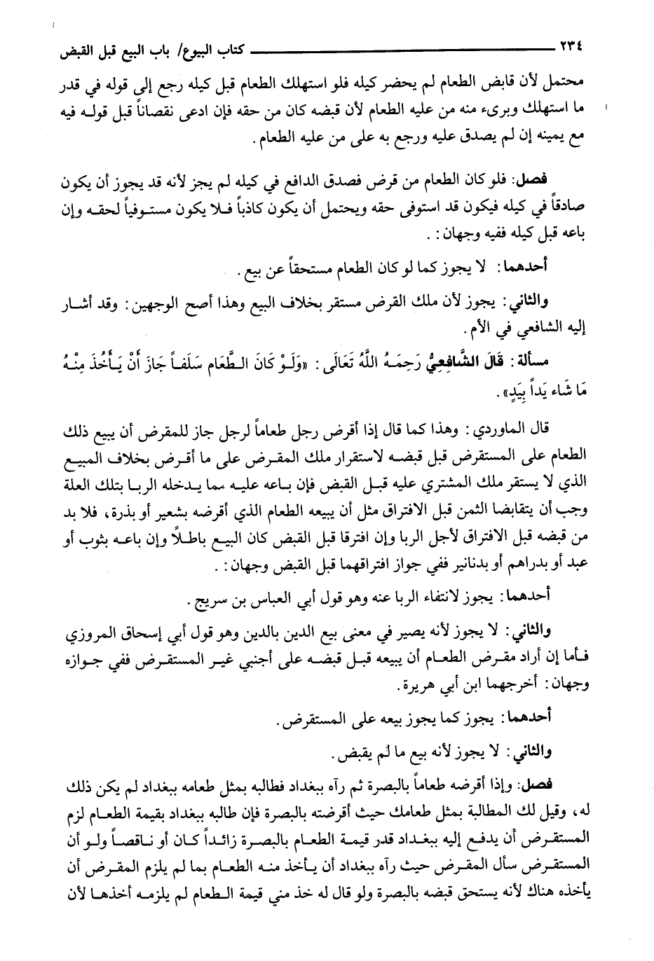 قَالَ الْمَاوَرْدِيُّ: وَهَذَا كَمَا قَالَ إِذَا أَقْرَضَ رَجُلٌ طَعَامًا لِرَجُلٍ جَازَ لِلْمُقْرِضِ أَنْ يَبِيعَ ذَلِكَ الطَّعَامَ عَلَى الْمُسْتَقْرِضِ قَبْلَ قَبْضِهِ لِاسْتِقْرَارِ مِلْكِ الْمُقْرِضِ عَلَى مَا أَقْرَضَ بِخِلَافِ الْمَبِيعِ الَّذِي لَا يَسْتَقِرُّ مِلْكُ الْمُشْتَرِي عَلَيْهِ قَبْلَ الْقَبْضِ فَإِنْ بَاعَهُ عَلَيْهِ مِمَّا يُدْخِلُهُ الرِّبَا بِتِلْكَ الْعِلَّةِ وَجَبَ أَنْ يَتَقَابَضَا الثَّمَنَ قَبْلَ الِافْتِرَاقِ مِثْلَ أَنْ يَبِيعَهُ الطَّعَامَ الَّذِي أَقْرَضَهُ بِشَعِيرٍ أَوْ بِذُرَةٍ، فَلَا بُدَّ مِنْ قَبْضِهِ قَبْلَ الِافْتِرَاقِ لِأَجْلِ الرِّبَا وَإِنِ افْتَرَقَا قَبْلَ الْقَبْضِ كَانَ الْبَيْعُ بَاطِلًا وَإِنْ بَاعَهُ بِثَوْبٍ أَوْ عَبْدٍ أَوْ بِدَرَاهِمَ أَوْ بِدَنَانِيرَ فَفِي جَوَازِ افْتِرَاقِهِمَا قَبْلَ الْقَبْضِ وَجْهَانِ: