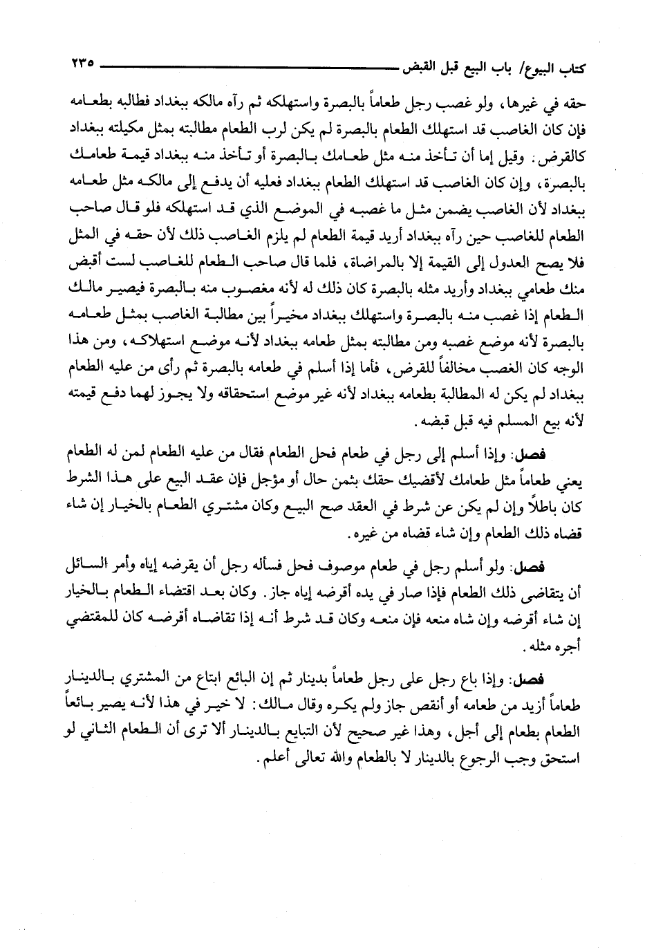 حَقَّهُ فِي غَيْرِهَا، وَلَوْ غَصَبَ رَجُلٌ طَعَامًا بِالْبَصْرَةِ وَاسْتَهْلَكَهُ ثُمَّ رَآهُ مَالِكُهُ بِبَغْدَادَ فَطَالَبَهُ بِطَعَامِهِ فَإِنْ كَانَ الْغَاصِبُ قَدِ اسْتَهْلَكَ الطَّعَامَ بِالْبَصْرَةِ لَمْ يَكُنْ لِرَبِّ الطَّعَامِ مُطَالَبَتُهُ بِمِثْلِ مِكْيَلَتِهِ بِبَغْدَادَ كَالْقَرْضِ. وَقِيلَ إِمَّا أَنْ تَأْخُذَ مِنْهُ مِثْلَ طَعَامِكَ بِالْبَصْرَةِ أَوْ تَأْخُذَ مِنْهُ بِبَغْدَادَ قِيمَةَ طَعَامِكَ بِالْبَصْرَةِ، وَإِنْ كَانَ الْغَاصِبُ قَدِ اسْتَهْلَكَ الطَّعَامَ بِبَغْدَادَ فَعَلَيْهِ أَنْ يَدْفَعَ إِلَى مَالِكِهِ مِثْلَ طَعَامِهِ بِبَغْدَادَ لِأَنَّ الْغَاصِبَ يضمن مثل ما غصبه في الموضع الَّذِي قَدِ اسْتَهْلَكَهُ فَلَوْ قَالَ صَاحِبُ الطَّعَامِ لِلْغَاصِبِ حِينَ رَآهُ بِبَغْدَادَ أُرِيدُ قِيمَةَ الطَّعَامِ لَمْ يَلْزَمِ الْغَاصِبُ ذَلِكَ لِأَنَّ حَقَّهُ فِي الْمِثْلِ فَلَا يَصِحُّ الْعُدُولُ إِلَى الْقِيمَةِ إِلَّا بِالْمُرَاضَاةِ، فَلَمَّا قَالَ صَاحِبُ الطَّعَامِ لِلْغَاصِبِ لَسْتُ أَقْبِضُ مِنْكَ طَعَامِي بِبَغْدَادَ وَأُرِيدُ مِثْلَهُ بِالْبَصْرَةِ كَانَ ذَلِكَ لَهُ لِأَنَّهُ مَغْصُوبٌ مِنْهُ بِالْبَصْرَةِ فَيَصِيرُ مَالِكُ الطَّعَامِ إِذَا غُصِبَ مِنْهُ بِالْبَصْرَةِ وَاسْتُهْلِكَ بِبَغْدَادَ مُخَيَّرًا بَيْنَ مُطَالَبَةِ الْغَاصِبِ بِمِثْلِ طَعَامِهِ بِالْبَصْرَةِ لِأَنَّهُ مَوْضِعُ غَصْبِهِ وَمِنْ مُطَالَبَتِهِ بِمِثْلِ طَعَامِهِ بِبَغْدَادَ لِأَنَّهُ مَوْضِعُ اسْتِهْلَاكِهِ، وَمِنْ هَذَا الْوَجْهِ كَانَ الْغَصْبُ مُخَالِفًا لِلْقَرْضِ، فَأَمَّا إِذَا أَسْلَمَ فِي طَعَامِهِ بِالْبَصْرَةِ ثُمَّ رَأَى مَنْ عَلَيْهِ الطَّعَامُ بِبَغْدَادَ لَمْ يَكُنْ لَهُ الْمُطَالَبَةُ بِطَعَامِهِ بِبَغْدَادَ لِأَنَّهُ غَيْرُ مَوْضِعِ اسْتِحْقَاقِهِ وَلَا يَجُوزُ لَهُمَا دَفْعُ قِيمَتِهِ لِأَنَّهُ بَيْعُ الْمُسْلَمِ فِيهِ قَبْلَ قَبْضِهِ.