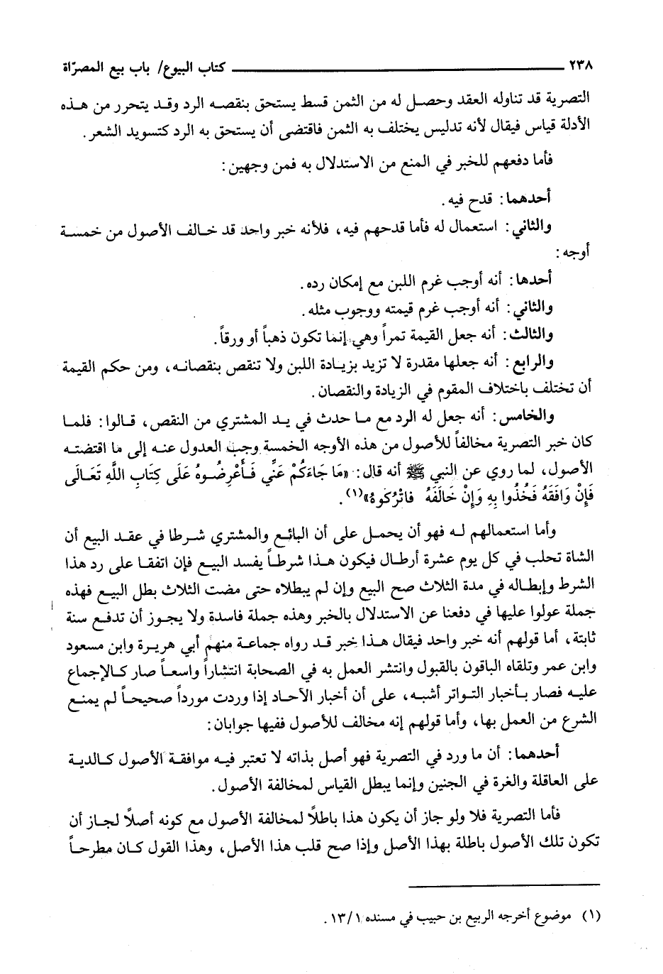 وَالْخَامِسُ: أَنَّهُ جَعَلَ لَهُ الرَّدُّ مَعَ مَا حَدَثَ فِي يَدِ الْمُشْتَرِي مِنَ النَّقْصِ، قَالُوا: فَلَمَّا كَانَ خَبَرُ التَّصْرِيَةِ مُخَالِفًا لِلْأُصُولِ مِنْ هَذِهِ الْأَوْجُهِ الْخَمْسَةِ وَجَبَ الْعُدُولُ عَنْهُ إِلَى مَا اقْتَضَتْهُ الْأُصُولُ، لِمَا رُوِيَ عَنِ النَّبِيِّ - صَلَّى اللَّهُ عَلَيْهِ وَسَلَّم َ - أَنَّهُ قَالَ: " مَا جَاءَكُمْ عَنِّي فَاعْرِضُوهُ عَلَى كِتَابِ اللَّهِ تَعَالَى فَإِنْ وَافَقَهُ فَخُذُوا بِهِ وَإِنْ خَالَفَهُ فَاتْرُكُوهُ ".