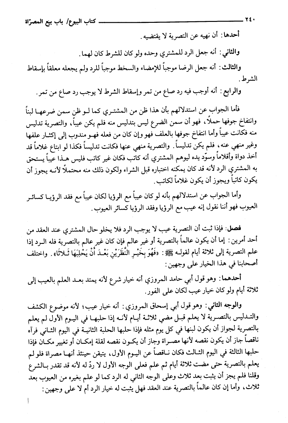 فَإِذَا ثَبَتَ أَنَّ التَّصْرِيَةَ عَيْبٌ لَا يُوجِبُ الرَّدَّ فَلَا يَخْلُو حَالُ الْمُشْتَرِي عِنْدَ الْعَقْدِ مِنْ أَحَدِ أَمْرَيْنِ: إِمَّا أَنْ يَكُونَ عَالِمًا بِالتَّصْرِيَةِ أَوْ غَيْرَ عَالِمٍ فَإِنْ كَانَ غَيْرَ عَالِمٍ بِالتَّصْرِيَةِ فَلَهُ الرَّدُّ إِذَا عَلِمَ التَّصْرِيَةَ إِلَى ثَلَاثَةِ أيام لقوله - صَلَّى اللَّهُ عَلَيْهِ وَسَلَّم َ -: " فَهُوَ بِخَيْرِ النَّظَرَيْنِ بَعْدَ أَنْ يَحْلِبَهَا ثَلَاثًا ". وَاخْتَلَفَ أَصْحَابُنَا فِي هَذَا الْخِيَارِ عَلَى وَجْهَيْنِ: