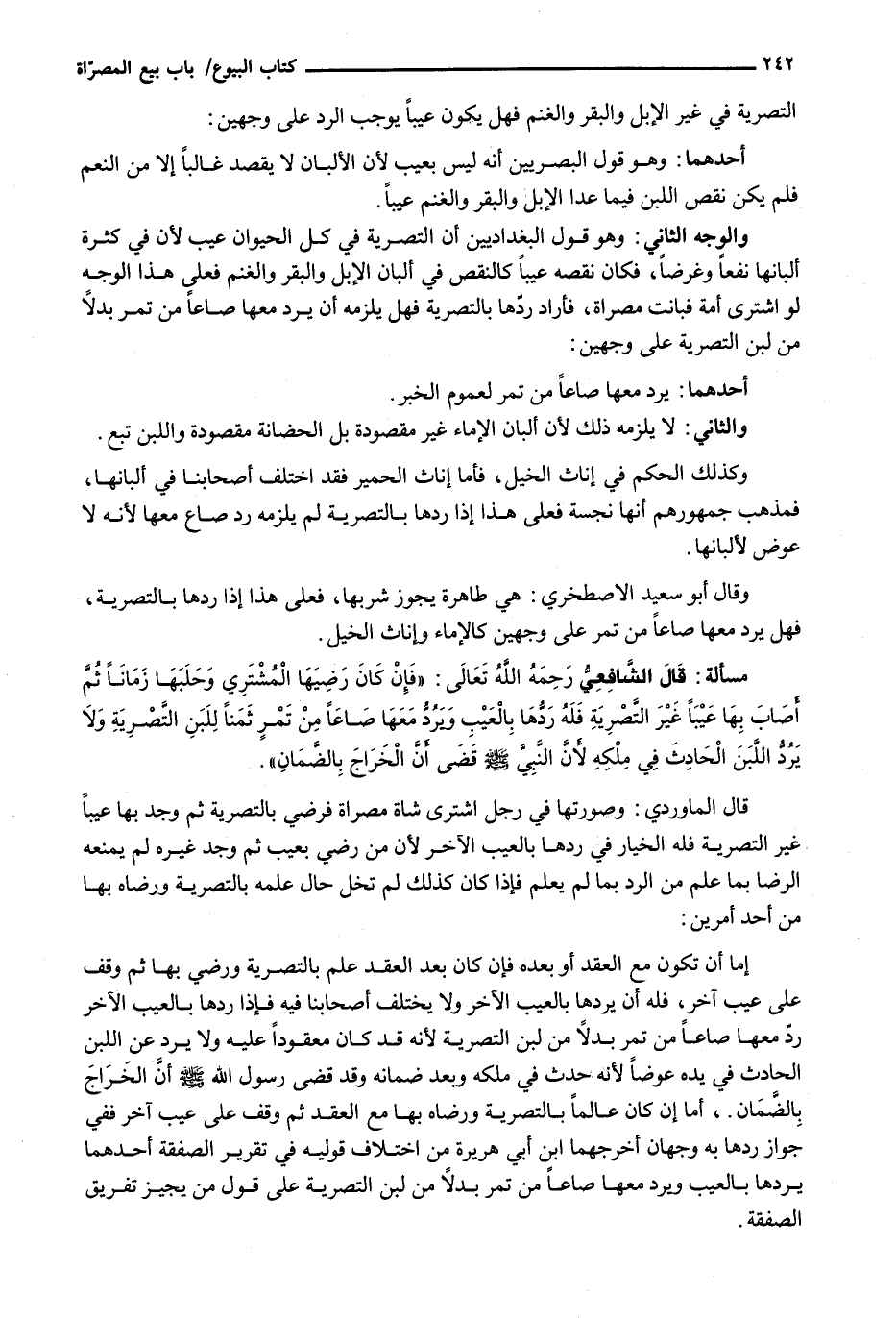 وَالْوَجْهُ الثَّانِي: وَهُوَ قَوْلُ الْبَغْدَادِيِّينَ إِنَّ التَّصْرِيَةَ فِي كُلِّ الْحَيَوَانِ عَيْبٌ لِأَنَّ فِي كَثْرَةِ أَلْبَانِهَا نَفْعًا وَغَرَضًا، فَكَانَ نَقْصُهُ عَيْبًا كَالنَّقْصِ فِي أَلْبَانِ الْإِبِلِ وَالْبَقَرِ وَالْغَنَمِ فَعَلَى هَذَا الْوَجْهِ لَوِ اشْتَرَى أَمَةً فَبَانَتْ مُصَرَّاةً، فَأَرَادَ رَدَّهَا بِالتَّصْرِيَةِ فَهَلْ يَلْزَمُهُ أَنْ يَرُدَّ مَعَهَا صَاعًا مِنْ تَمْرٍ بَدَلًا مِنْ لَبَنِ التَّصْرِيَةِ عَلَى وَجْهَيْنِ: