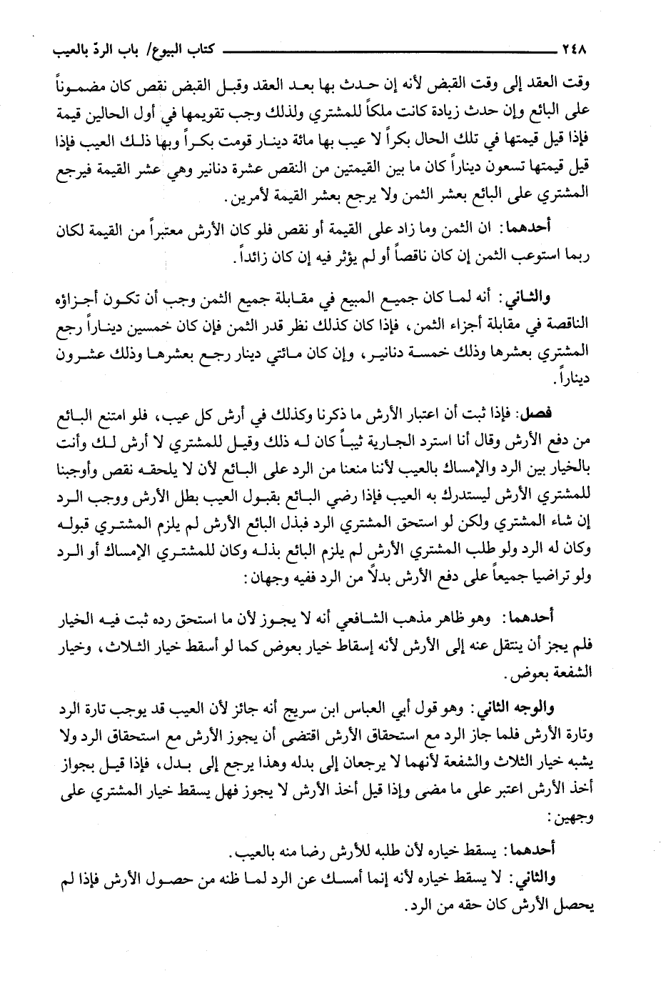 وَالْوَجْهُ الثَّانِي: وَهُوَ قَوْلُ أَبِي الْعَبَّاسِ ابْنِ سُرَيْجٍ إِنَّهُ جَائِزٌ لِأَنَّ الْعَيْبَ قَدْ يُوجِبُ تَارَةً الرَّدَّ وَتَارَةً الْأَرْشَ فَلَمَّا جَازَ الرَّدُّ مَعَ اسْتِحْقَاقِ الْأَرْشِ اقْتَضَى أَنْ يَجُوزَ الْأَرْشُ مَعَ اسْتِحْقَاقِ الرَّدِّ وَلَا يُشْبِهُ خِيَارَ الثَّلَاثِ وَالشُّفْعَةَ لِأَنَّهُمَا لَا يَرْجِعَانِ إِلَى بَدَلِهِ وَهَذَا يَرْجِعُ إِلَى بَدَلٍ، فَإِذَا قِيلَ بِجَوَازِ أَخْذِ الْأَرْشِ اعْتُبِرَ عَلَى مَا مَضَى وَإِذَا قِيلَ أَخْذُ الْأَرْشِ لَا يَجُوزُ فَهَلْ يَسْقُطُ خِيَارُ الْمُشْتَرِي عَلَى وَجْهَيْنِ: