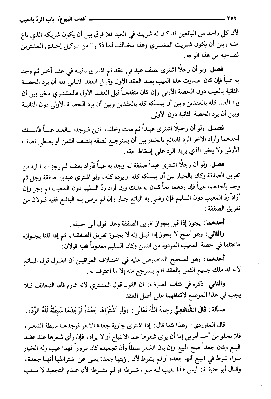 وَلَوْ أَنَّ رَجُلًا اشْتَرَى عَبْدًا صَفْقَةً ثُمَّ وَجَدَ بِهِ عَيْبًا فَأَرَادَ بَعْضَهُ لَمْ يَجُزْ لِمَا فِيهِ مِنْ تَفْرِيقِ الصَّفْقَةِ وَكَانَ بِالْخِيَارِ بَيْنَ أَنْ يُمْسِكَهُ كُلَّهُ أَوْ يَرُدَّهُ كُلَّهُ، وَلَوِ اشْتَرَى عَبْدَيْنِ صفقة رَجُلٍ ثُمَّ وَجَدَ بِأَحَدِهِمَا عَيْبًا فَإِنْ رَدَّهُمَا مَعًا كَانَ لَهُ ذَلِكَ وَإِنْ أَرَادَ رَدَّ السَّلِيمِ دُونَ الْمَعِيبِ لَمْ يَجُزْ وَإِنْ أَرَادَ رَدَّ الْمَعِيبِ دُونَ السَّلِيمِ فَإِنْ رَضِيَ بِهِ الْبَائِعُ جَازَ وَإِنْ لَمْ يَرْضَ بِهِ الْبَائِعُ فَفِيهِ قَوْلَانِ مِنْ تَفْرِيقِ الصَّفْقَةِ: