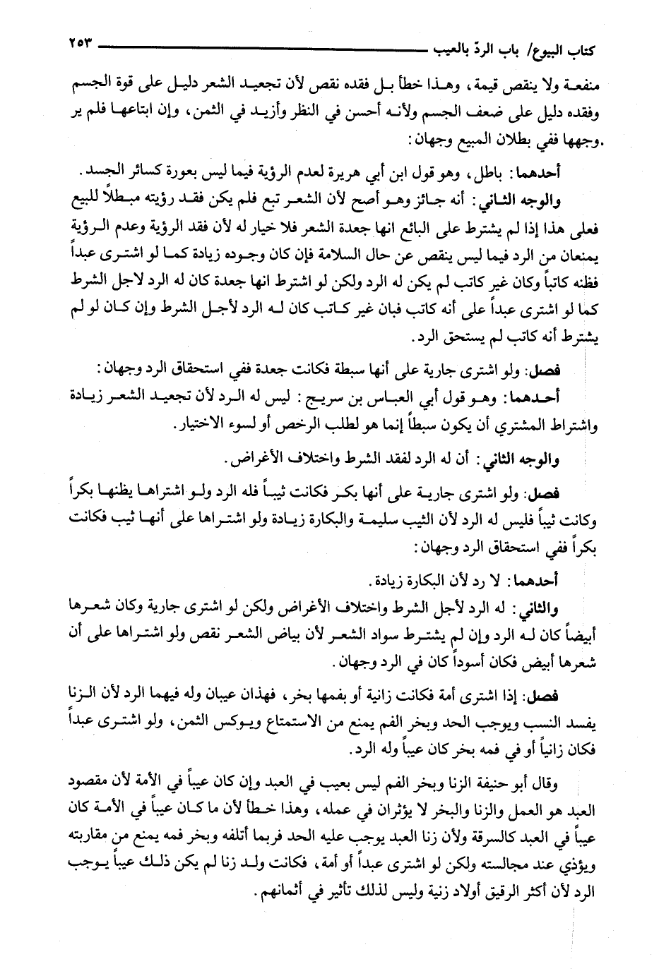مَنْفَعَةً وَلَا يَنْقُصُ قِيمَةً، وَهَذَا خَطَأٌ بَلْ فَقْدُهُ نَقْصٌ لِأَنَّ تَجْعِيدَ الشَّعْرِ دَلِيلٌ عَلَى قُوَّةِ الْجِسْمِ وَفَقْدِهِ دَلِيلٌ عَلَى ضَعْفِ الْجِسْمِ وَلِأَنَّهُ أَحْسَنُ فِي النَّظَرِ وَأَزْيَدُ فِي الثَّمَنِ، وَإِنِ ابْتَاعَهَا فَلَمْ يَرَ وَجْهَهَا فَفِي بُطْلَانِ الْمَبِيعِ وَجْهَانِ: