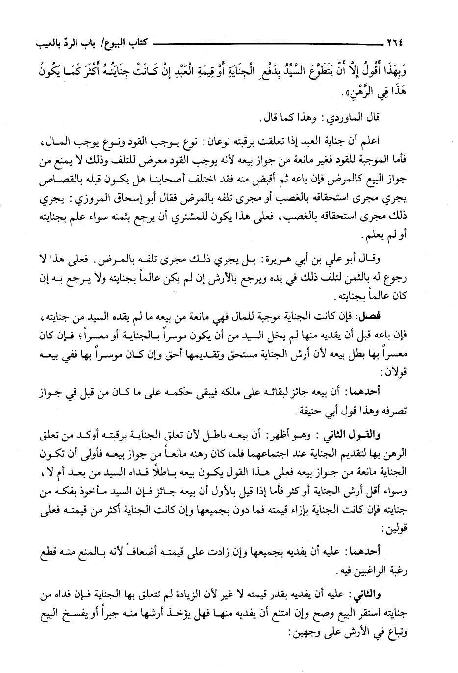 اعْلَمْ أَنَّ جِنَايَةَ الْعَبْدِ إِذَا تَعَلَّقَتْ بِرَقَبَتِهِ نَوْعَانِ: نَوْعٌ يُوجِبُ الْقَوَدَ وَنَوْعٌ يُوجِبُ الْمَالَ، فَأَمَّا الْمُوجِبَةُ لِلْقَوَدِ فَغَيْرُ مَانِعَةٍ مِنْ جَوَازِ بَيْعِهِ لِأَنَّهُ يوجب الْقَوَدَ مُعَرَّضٌ لِلتَّلَفِ وَذَلِكَ لَا يَمْنَعُ مِنْ جَوَازِ الْبَيْعِ كَالْمَرَضِ فَإِنْ بَاعَهُ ثُمَّ أَقْبَضَ منه فقد اختلف أصحابنا هل يكون قبله بِالْقِصَاصِ يَجْرِي مَجْرَى اسْتِحْقَاقِهِ بِالْغَصْبِ أَوْ مَجْرَى تَلَفِهِ بِالْمَرَضِ فَقَالَ أَبُو إِسْحَاقَ الْمَرْوَزِيُّ: يَجْرِي ذَلِكَ مَجْرَى اسْتِحْقَاقِهِ بِالْغَصْبِ، فَعَلَى هَذَا يَكُونُ لِلْمُشْتَرِي أَنْ يَرْجِعَ بِثَمَنِهِ سَوَاءٌ عَلِمَ بِجِنَايَتِهِ أَوْ لَمْ يَعْلَمْ.