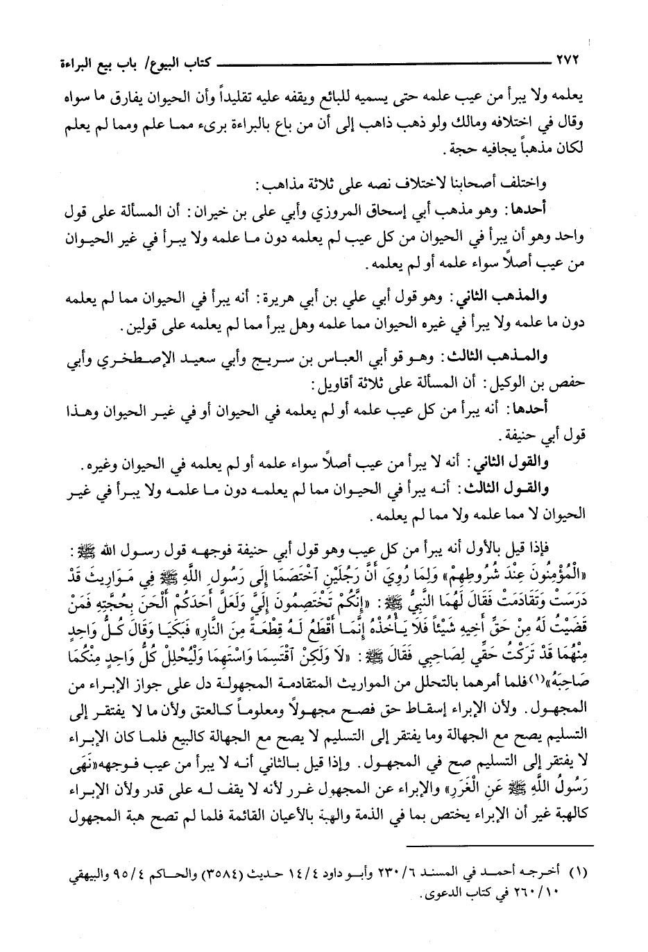 فَإِذَا قِيلَ بِالْأَوَّلِ إِنَّهُ يَبْرَأُ مِنْ كُلِّ عَيْبٍ وَهُوَ قَوْلُ أبي حنيفة فَوَجْهُهُ قَوْلُ رَسُولِ اللَّهِ - صَلَّى اللَّهُ عَلَيْهِ وَسَلَّم َ -: " الْمُؤْمِنُونَ عِنْدَ شُرُوطِهِمْ " وَلِمَا رُوِيَ أَنَّ رَجُلَيْنِ اخْتَصَمَا إِلَى رَسُولِ اللَّهِ - صَلَّى اللَّهُ عَلَيْهِ وَسَلَّم َ - فِي مَوَارِيثَ قَدْ دَرَسَتْ وَتَقَادَمَتْ فَقَالَ لَهُمَا النبي - صَلَّى اللَّهُ عَلَيْهِ وَسَلَّم َ -: " إِنَّكُمْ تَخْتَصِمُونَ إِلَيَّ وَلَعَلَّ أَحَدَكُمْ أَلْحَنُ بِحُجَّتِهِ فَمَنْ قَضَيْتُ لَهُ مِنْ حَقِّ أَخِيهِ شَيْئًا فَلَا يَأْخُذْهُ إِنَمَا أَقْطَعُ لَهُ قِطْعَةً مِنَ النَّارِ " فَبَكَيَا وَقَالَ كُلُّ وَاحِدٍ مِنْهُمَا قَدْ تَرَكْتُ حَقِّي لِصَاحِبِي فَقَالَ - صَلَّى اللَّهُ عَلَيْهِ وَسَلَّم َ -: " لَا وَلَكِنِ اقْتَسِمَا وَاسْتَهِمَا وَلْيُحْلِلْ كُلُّ وَاحِدٍ مِنْكُمَا صَاحِبَهُ " فَلَمَّا أَمَرَهُمَا بِالتَّحَلُّلِ مِنَ الْمَوَارِيثِ الْمُتَقَادِمَةِ الْمَجْهُولَةِ دَلَّ عَلَى جَوَازِ الْإِبْرَاءِ مِنَ الْمَجْهُولِ. وَلِأَنَّ الْإِبْرَاءَ إِسْقَاطُ حَقٍّ فَصَحَّ مَجْهُولًا وَمَعْلُومًا كَالْعِتْقِ وَلِأَنَّ مَا لَا يَفْتَقِرُ إِلَى التَّسْلِيمِ يَصِحُّ مَعَ الْجَهَالَةِ وَمَا يَفْتَقِرُ إِلَى التَّسْلِيمِ لَا يَصِحُّ مَعَ الْجَهَالَةِ كَالْبَيْعِ فَلَمَّا كَانَ الْإِبْرَاءُ لَا يَفْتَقِرُ إِلَى التَّسْلِيمِ صَحَّ فِي الْمَجْهُولِ. وَإِذَا قِيلَ بِالثَّانِي إِنَّهُ لَا يَبْرَأُ مِنْ عَيْبٍ فَوَجْهُهُ " نَهَى رَسُولُ اللَّهِ - صَلَّى اللَّهُ عَلَيْهِ وَسَلَّم َ - عَنِ الْغَرَرِ " وَالْإِبْرَاءُ عَنِ الْمَجْهُولِ غَرَرٌ لِأَنَّهُ لَا يَقِفُ لَهُ عَلَى قَدْرٍ وَلِأَنَّ الْإِبْرَاءَ كَالْهِبَةِ غَيْرَ أَنَّ الْإِبْرَاءَ يَخْتَصُّ بِمَا فِي الذمة والهبة بِالْأَعْيَانِ الْقَائِمَةِ فَلَمَّا لَمْ تَصِحَّ هِبَةُ الْمَجْهُولِ