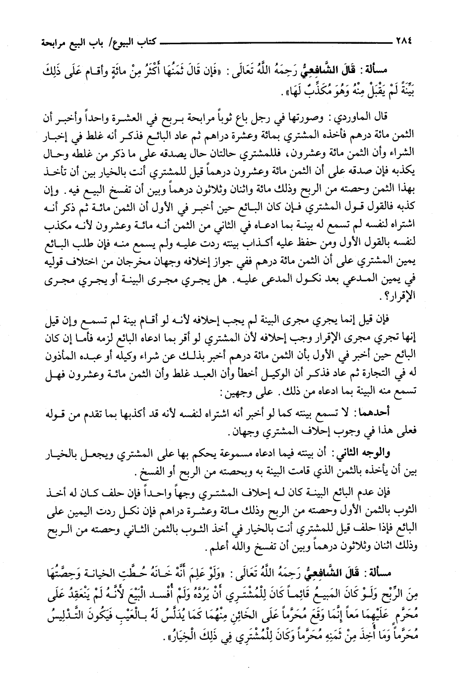 قَالَ الْمَاوَرْدِيُّ: وَصُورَتُهَا فِي رَجُلٍ بَاعَ ثَوْبًا مُرَابَحَةً بِرِبْحٍ فِي الْعَشْرَةِ وَاحِدًا وَأَخْبَرَ أَنَّ الثَّمَنَ مِائَةُ دِرْهَمٍ فَأَخَذَهُ الْمُشْتَرِي بِمِائَةٍ وَعَشَرَةِ دَرَاهِمَ ثُمَّ عَادَ الْبَائِعُ فَذَكَرَ أَنَّهُ غَلِطَ فِي إِخْبَارِ الشِّرَاءِ وَأَنَّ الثَّمَنَ مِائَةٌ وَعِشْرُونَ، فَلِلْمُشْتَرِي حَالَتَانِ حَالٌ يُصَدِّقُهُ عَلَى مَا ذَكَرَ مِنْ غَلَطِهِ وَحَالٌ يُكَذِّبُهُ فَإِنْ صَدَّقَهُ عَلَى أَنَّ الثَّمَنَ مِائَةٌ وَعِشْرُونَ دِرْهَمًا قِيلَ لِلْمُشْتَرِي أَنْتَ بِالْخِيَارِ بَيْنَ أَنْ تَأْخُذَ بِهَذَا الثَّمَنِ وَحِصَّتِهِ مِنَ الرِّبْحِ وَذَلِكَ مِائَةٌ وَاثْنَانِ وَثَلَاثُونَ دِرْهَمًا وَبَيْنَ أَنْ تَفْسَخَ الْبَيْعَ فِيهِ. وَإِنْ كَذَّبَهُ فَالْقَوْلُ قَوْلُ الْمُشْتَرِي فَإِنْ كَانَ الْبَائِعُ حِينَ أَخْبَرَ فِي الْأَوَّلِ أَنَّ الثَّمَنَ مِائَةٌ ثُمَّ ذَكَرَ أَنَّهُ اشْتَرَاهُ لِنَفْسِهِ لَمْ تُسْمِعْ لَهُ بَيِّنَةٌ بِمَا ادَّعَاهُ فِي الثَّانِي مِنَ الثَّمَنِ أَنَّهُ مِائَةٌ وَعِشْرُونَ لِأَنَّهُ مُكَذِّبٌ لِنَفْسِهِ بِالْقَوْلِ الْأَوَّلِ وَمَنْ حُفِظَ عَلَيْهِ أَكْذَابُ بَيِّنَتِهِ رُدَّتْ عَلَيْهِ وَلَمْ يُسْمَعْ مِنْهُ فَإِنْ طَلَبَ الْبَائِعُ يَمِينَ الْمُشْتَرِي عَلَى أَنَّ الثَّمَنَ مِائَةُ دِرْهَمٍ فَفِي جَوَازِ إِخْلَافِهِ وَجْهَانِ مُخَرَّجَانِ مِنَ اخْتِلَافِ قَوْلَيْهِ فِي يَمِينِ الْمُدَّعِي بَعْدَ نُكُولِ الْمُدَّعَى عَلَيْهِ. هَلْ يَجْرِي مَجْرَى الْبَيِّنَةِ أَوْ يَجْرِي مَجْرَى الْإِقْرَارِ؟ .