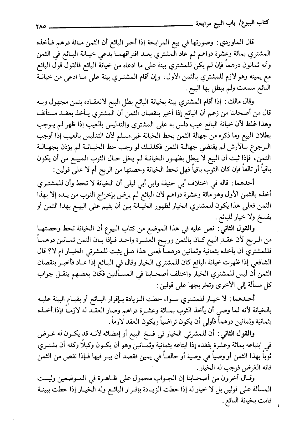 قَالَ الْمَاوَرْدِيُّ: وَصُورَتُهَا فِي بَيْعِ الْمُرَابَحَةِ إِذَا أَخْبَرَ الْبَائِعُ أَنَّ الثَّمَنَ مِائَةُ دِرْهَمٍ فَأَخَذَهُ الْمُشْتَرِي بِمِائَةٍ وَعَشَرَةِ دَرَاهِمَ ثُمَّ عَادَ الْمُشْتَرِي بَعْدَ افْتِرَاقِهِمَا يَدَّعِي خِيَانَةَ الْبَائِعِ فِي الثَّمَنِ وَأَنَّهُ ثَمَانُونَ دِرْهَمًا فَإِنْ لَمْ يَكُنْ لِلْمُشْتَرِي بَيِّنَةٌ عَلَى مَا ادَّعَاهُ مِنْ خِيَانَةِ الْبَائِعِ فَالْقَوْلُ قَوْلُ الْبَائِعِ مَعَ يَمِينِهِ وَهُوَ لَازِمٌ لِلْمُشْتَرِي بِالثَّمَنِ الْأَوَّلِ، وَإِنْ أَقَامَ الْمُشْتَرِي بَيِّنَةً عَلَى مَا ادَّعَى مِنْ خِيَانَةِ الْبَائِعِ سُمِعَتْ وَلَمْ يَبْطُلْ بِهَا الْبَيْعُ.