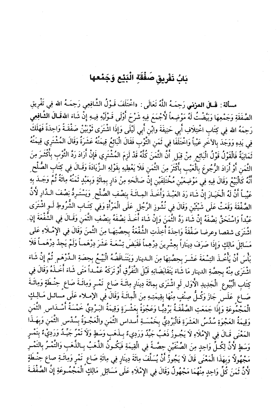 قَالَ المزني رحمه الله تعالى: " اخْتَلَفَ قَوْلُ الشَّافِعِيِّ رَحِمَهُ اللَّهُ فِي تَفْرِيقِ الصَّفْقَةِ وَجَمْعِهَا وَبَيَّضْتُ لَهُ مَوْضِعًا لِأَجْمَعَ فِيهِ شَرْحَ أَوْلَى قَوْلَيْهِ فِيهِ إِنْ شَاءَ اللَّهُ. قال الشَّافِعِيَّ رَحِمَهُ اللَّهُ فِي كِتَابِ اخْتِلَافِ أَبِي حَنِيفَةَ وَابْنِ أَبِي ليلى وإذا اشترى ثوبين صفقة واحدة فهلك في يده ووجد بالآخر عيبا واختلفا في ثمن الثوب فقال البائع قيمته عشرة وقال المشتري قيمته ثمانية فالقول قول البائع من قبل أن الثمن كله قد لزم المشتري فإن أراد رد الثوب بأكثر من الثمن أو أراد الرجوع بالعيب بأكثر من الثمن فلا يعطيه بقوله الزيادة وقال في كتاب الصلح أنه كالبيع وقال فيه في موضعين مختلفين إن صالحه من دار بمائة وبعبد ثمنه مائة ثم وجد به عيبا أن له الخيار إن شاء رد العبد وأخذ المائة بنصف الصلح ويسترد نصف الدار لأن الصفقة وقعت على شيئين وقال في نشوز الرجل على المرأة وفي كتاب الشروط لو اشترى عبدا واستحق نصفه إن شاء رد الثمن وإن شاء أخذ نصفه بنصف الثمن وقال في الشفعة إن اشترى شقصا وعرضا صفقة واحدة أخذت الشفعة بحصتها من الثمن وقال في الإملاء على مسائل مالك وإذا صرف دينارا بعشرين درهما فقبض تسعة عشر درهما ولم يجد درهما فلا بأس أن يأخذ التسعة عشر بحصتها من الدينار ويتناقضه البيع بحصة الدرهم ثم إن شاء اشترى منه بحصة الدينار ما شاء يتقابضانه قبل التفرق أو تركه عمدا متى شاء أخذه وقال في كتاب البيوع الجديد الأول لو اشترى بمائة دينار مائة صاع تمر ومائة صاع حنطة ومائة صاع علس جاز وكل صنف منها بقيمته من المائة وقال في الإملاء على مسائل مالك المجموعة وإذا جمعت الصفقة برديا وعجوة بعشرة وقيمة البردي خمسة أسداس الثمن وقيمة العجوة سدس العشرة فالبردي بخمسة أسداس الثمن والعجوة بسدس الثمن وبهذا المعنى قال في الإملاء لا يجوز ذهب جيد ورديء بذهب وسط ولا تمر جيد ورديء بتمر وسط لأن لكل واحد من الصنفين حصة في القيمة فيكون الذهب بالذهب والتمر بالتمر مجهولا وبهذا المعنى قال لا يجوز أن يسلف مائة دينار في مائة صاع تمر ومائة صاع حنطة لأن ثمن كل واحد منهما مجهول وقال في الإملاء على مسائل مالك المجموعة إن الصفقة