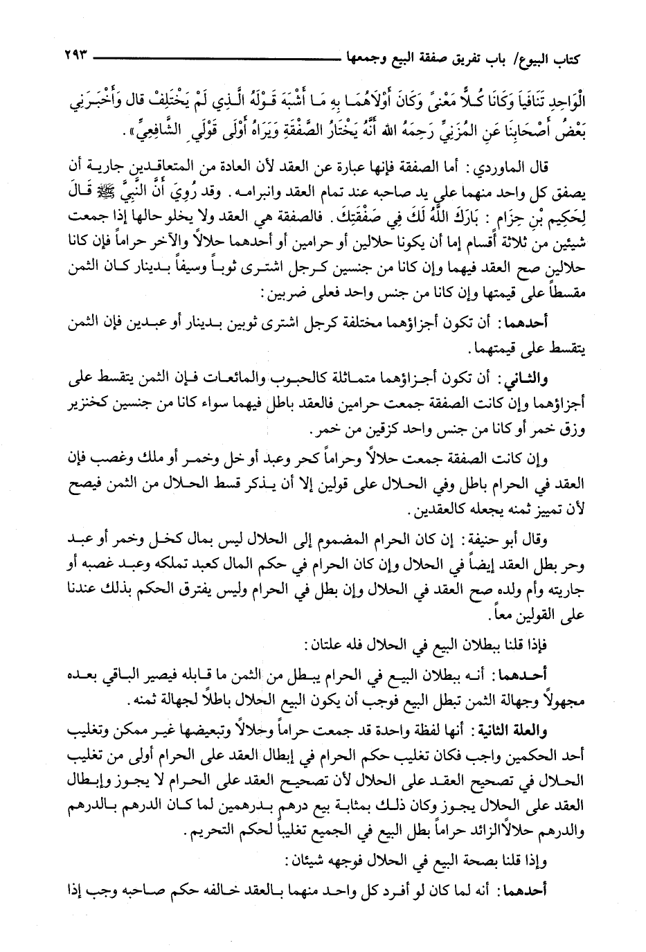 قَالَ الْمَاوَرْدِيُّ: أَمَّا الصَّفْقَةُ فَإِنَّهَا عِبَارَةٌ عَنِ الْعَقْدِ لِأَنَّ الْعَادَةَ مِنَ الْمُتَعَاقِدِينَ جَارِيَةٌ أَنْ يُصَفِّقَ كُلٌّ وَاحِدٍ مِنْهُمَا عَلَى يَدِ صَاحِبِهِ عِنْدَ تَمَامِ الْعَقْدِ وَانْبِرَامِهِ. وَقَدْ رُوِيَ أَنَّ النَّبِيَّ - صَلَّى اللَّهُ عَلَيْهِ وَسَلَّم َ - قَالَ لِحَكِيمِ بْنِ حِزَامٍ: بَارَكَ اللَّهُ لَكَ فِي صَفْقَتِكَ. فَالصَّفْقَةُ هِيَ الْعَقْدُ وَلَا يَخْلُو حَالُهَا إِذَا جَمَعَتْ شَيْئَيْنِ مِنْ ثَلَاثَةِ أَقْسَامٍ إِمَّا أَنْ يَكُونَا حَلَالَيْنِ أَوْ حَرَامَيْنِ أَوْ أحدهما حَلَالًا وَالْآخَرُ حَرَامًا فَإِنْ كَانَا حَلَالَيْنِ صَحَّ العقد فيهما وإن كان مِنْ جِنْسَيْنِ كَرَجُلٍ اشْتَرَى ثَوْبًا وَسَيْفًا بِدِينَارٍ كَانَ الثَّمَنُ مُقَسَّطًا عَلَى قِيمَتِهَا وَإِنْ كَانَا مِنْ جِنْسٍ وَاحِدٍ فَعَلَى ضَرْبَيْنِ: