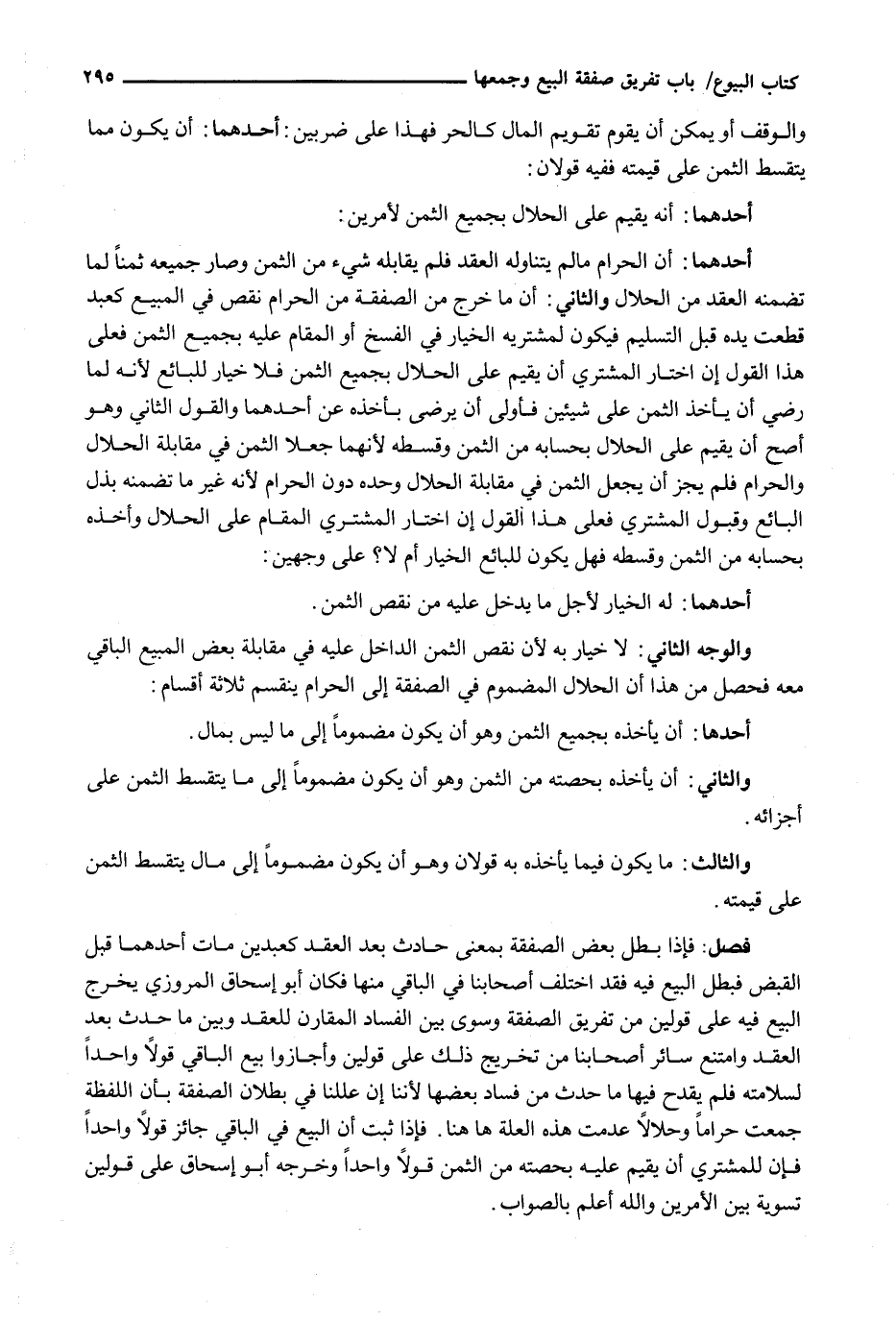 أَحَدُهُمَا: أَنَّ الْحَرَامَ مَا لَمْ يَتَنَاوَلْهُ الْعَقْدُ فَلَمْ يُقَابِلْهُ شَيْءٌ مِنَ الثَّمَنِ وَصَارَ جَمِيعُهُ ثَمَنًا لِمَا تَضَمَّنَهُ الْعَقْدُ مِنَ الْحَلَالِ وَالثَّانِي: أَنَّ مَا خَرَجَ مِنَ الصَّفْقَةِ مِنَ الْحَرَامِ نَقْصٌ فِي الْمَبِيعِ كَعَبْدٍ قُطِعَتْ يَدُهُ قَبْلَ التَّسْلِيمِ فَيَكُونُ لِمُشْتَرِيهِ الْخِيَارُ فِي الْفَسْخِ أَوِ الْمُقَامِ عَلَيْهِ بِجَمِيعِ الثَّمَنِ فَعَلَى هَذَا الْقَوْلِ إِنِ اخْتَارَ الْمُشْتَرِي أَنْ يُقِيمَ عَلَى الْحَلَالِ بِجَمِيعِ الثَّمَنِ فَلَا خِيَارَ لِلْبَائِعِ لِأَنَّهُ لَمَّا رَضِيَ أَنْ يَأْخُذَ الثَّمَنَ عَلَى شَيْئَيْنِ فَأَوْلَى أَنْ يَرْضَى بِأَخْذِهِ عَنْ أَحَدِهِمَا وَالْقَوْلُ الثَّانِي وَهُوَ أَصَحُّ أَنْ يُقِيمَ عَلَى الْحَلَالِ بِحِسَابِهِ مِنَ الثَّمَنِ وَقِسْطِهِ لِأَنَّهُمَا جَعَلَا الثَّمَنَ فِي مُقَابَلَةِ الْحَلَالِ وَالْحَرَامِ فَلَمْ يَجُزْ أَنْ يُجْعَلَ الثَّمَنُ فِي مُقَابَلَةِ الْحَلَالِ وَحْدَهُ دُونَ الْحَرَامِ لِأَنَّهُ غَيْرُ مَا تَضَمَّنُهُ بَذْلُ الْبَائِعِ وَقَبُولُ الْمُشْتَرِي فَعَلَى هَذَا الْقَوْلِ إِنِ اخْتَارَ الْمُشْتَرِي الْمُقَامَ عَلَى الْحَلَالِ وَأَخَذَهُ بِحِسَابِهِ مِنَ الثَّمَنِ وَقِسْطِهِ فَهَلْ يَكُونُ لِلْبَائِعِ الْخِيَارُ أَمْ لَا؟ عَلَى وَجْهَيْنِ: