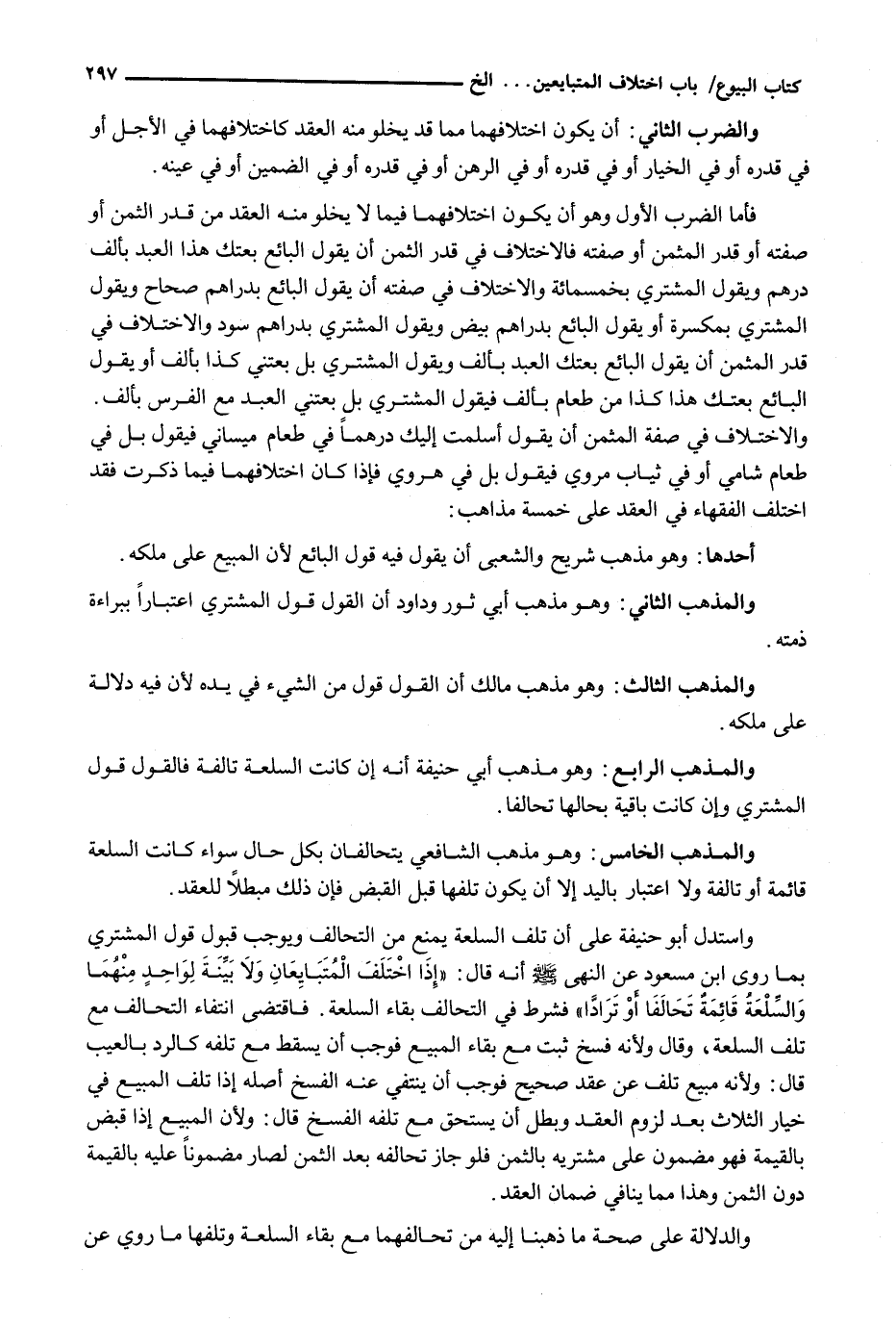 فَأَمَّا الضَّرْبُ الْأَوَّلُ وَهُوَ أَنْ يَكُونَ اخْتِلَافُهُمَا فِيمَا لَا يَخْلُو مِنْهُ الْعَقْدُ مِنْ قَدَرِ الثَّمَنِ أَوْ صِفَتِهِ أَوْ قَدْرِ الْمُثَمَّنِ أَوْ صِفَتِهِ فَالِاخْتِلَافُ فِي قَدْرِ الثَّمَنِ أَنْ يَقُولَ الْبَائِعُ بِعْتُكَ هَذَا الْعَبْدَ بِأَلْفِ دِرْهَمٍ وَيَقُولُ الْمُشْتَرِي بِخَمْسِمِائَةٍ وَالِاخْتِلَافُ فِي صِفَتِهِ أَنْ يَقُولَ الْبَائِعُ بِدَرَاهِمَ صِحَاحٍ وَيَقُولُ الْمُشْتَرِي بِمُكَسَّرَةٍ أَوْ يَقُولُ الْبَائِعُ بِدَرَاهِمَ بِيضٍ وَيَقُولُ الْمُشْتَرِي بِدَرَاهِمَ سُودٍ وَالِاخْتِلَافُ فِي قَدْرِ الْمُثَمَّنِ أَنْ يَقُولَ الْبَائِعُ بعتك العبد بِأَلْفٍ وَيَقُولَ الْمُشْتَرِي بَلْ بِعْتَنِي كَذَا بِأَلْفٍ أو يقول البائع بعتك هذا كذا من طعام بِأَلْفٍ فَيَقُولَ الْمُشْتَرِي بَلْ بِعْتَنِي الْعَبْدَ مَعَ الْفَرَسِ بِأَلْفٍ. وَالِاخْتِلَافُ فِي صِفَةِ الْمُثَمَّنِ أَنْ يَقُولَ أَسْلَمْتُ إِلَيْكَ دِرْهَمًا فِي طَعَامٍ مَيْسَانِيٍّ فَيَقُولُ بَلْ فِي طَعَامٍ شَامِيٍّ أَوْ فِي ثِيَابٍ مَرْوِيٍّ فَيَقُولُ بَلْ فِي هَرْوِيٍّ فَإِذَا كَانَ اخْتِلَافُهُمَا فِيمَا ذَكَرْتُ فَقَدِ اخْتَلَفَ الْفُقَهَاءُ فِي الْعَقْدِ عَلَى خَمْسَةِ مَذَاهِبَ: