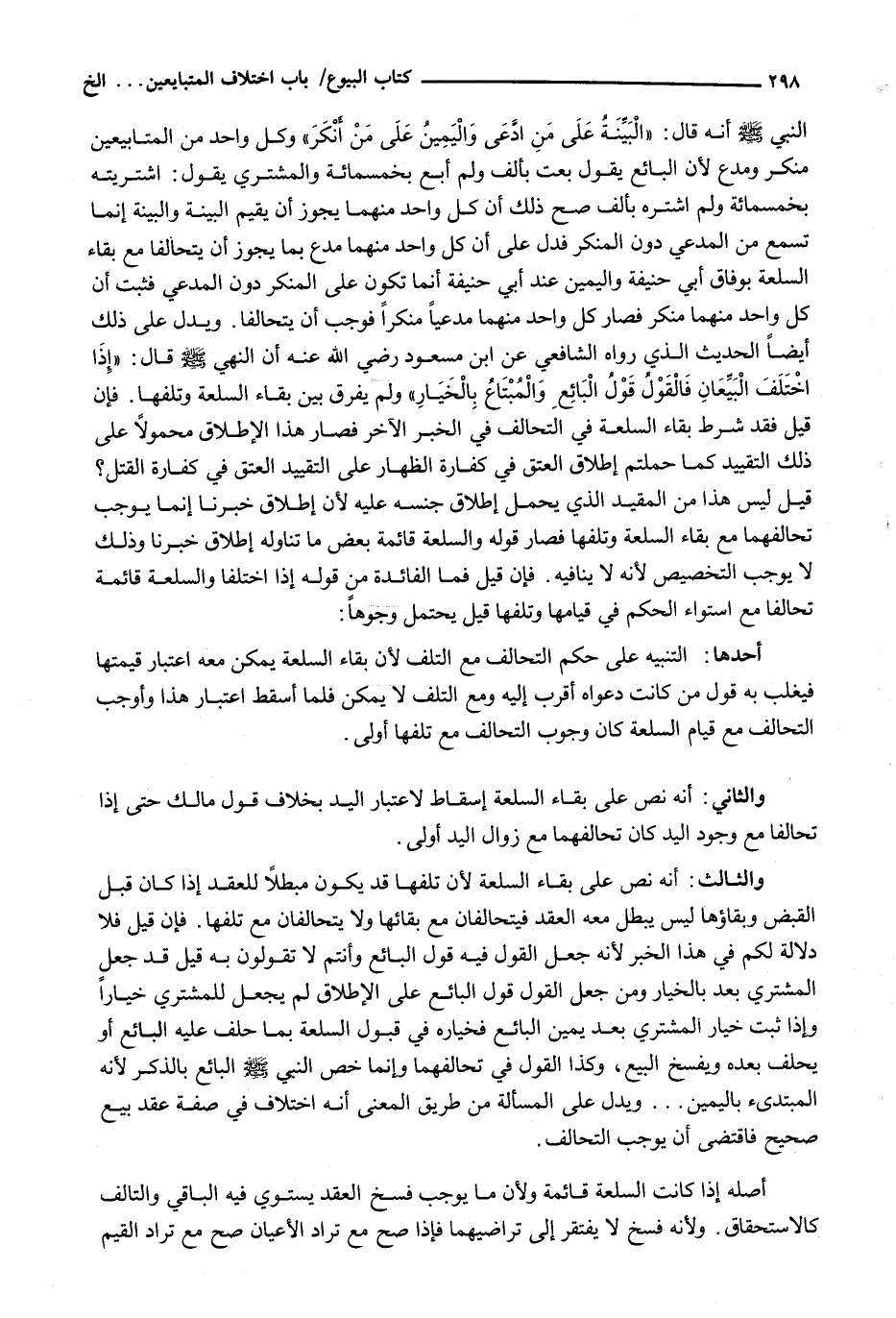 وَالثَّالِثُ: أَنَّهُ نَصَّ عَلَى بَقَاءِ السِّلْعَةِ لِأَنَّ تَلَفَهَا قَدْ يَكُونُ مُبْطِلًا لِلْعَقْدِ إِذَا كَانَ قَبْلَ الْقَبْضِ وَبَقَاؤُهَا لَيْسَ يَبْطُلُ مَعَهُ الْعَقْدُ فَيَتَحَالَفَانِ مَعَ بَقَائِهَا وَلَا يَتَحَالَفَانِ مَعَ تَلَفِهَا. فَإِنْ قِيلَ فَلَا دَلَالَةَ لَكُمْ فِي هَذَا الْخَبَرِ لِأَنَّهُ جَعَلَ الْقَوْلَ فِيهِ قَوْلَ الْبَائِعِ وَأَنْتُمْ لَا تَقُولُونَ بِهِ قِيلَ قَدْ جُعِلَ الْمُشْتَرِي بَعْدُ بِالْخِيَارِ وَمَنْ جَعَلَ الْقَوْلَ قَوْلَ الْبَائِعِ عَلَى الْإِطْلَاقِ لَمْ يَجْعَلْ لِلْمُشْتَرِي خِيَارًا وَإِذَا ثَبَتَ خِيَارُ الْمُشْتَرِي بَعْدَ يَمِينِ الْبَائِعِ فَخِيَارُهُ فِي قَبُولِ السِّلْعَةِ بِمَا حَلَفَ عَلَيْهِ الْبَائِعُ أَوْ يَحْلِفُ بَعْدَهُ وَيَفْسَخُ الْبَيْعَ، وَكَذَا الْقَوْلُ فِي تَحَالُفِهِمَا وَإِنَّمَا خص النبي - صَلَّى اللَّهُ عَلَيْهِ وَسَلَّم َ - الْبَائِعَ بِالذِّكْرِ لِأَنَّهُ الْمُبْتَدِئُ بِالْيَمِينِ ... وَيَدُلُّ عَلَى الْمَسْأَلَةِ مِنْ طَرِيقِ الْمَعْنَى أَنَّهُ اخْتِلَافٌ فِي صِفَةِ عَقْدِ بَيْعٍ صَحِيحٍ فَاقْتَضَى أَنْ يُوجِبَ التَّحَالُفَ.