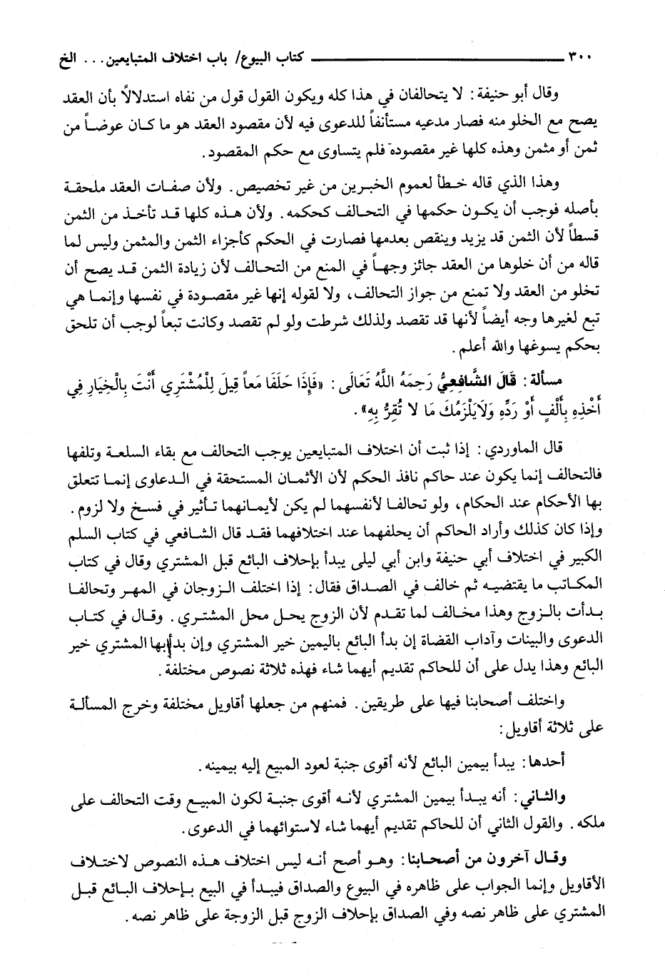 قَالَ الْمَاوَرْدِيُّ: إِذَا ثَبَتَ أَنَّ اخْتِلَافَ الْمُتَبَايِعِينَ يُوجِبُ التَّحَالُفَ مَعَ بَقَاءِ السِّلْعَةِ وَتَلَفِهَا فَالتَّحَالُفُ إِنَّمَا يَكُونُ عِنْدَ حَاكِمٍ نَافِذِ الْحُكْمِ لِأَنَّ الْأَثْمَانَ الْمُسْتَحَقَّةَ فِي الدَّعَاوَى إِنَّمَا تَتَعَلَّقُ بِهَا الْأَحْكَامُ عِنْدَ الْحُكَّامِ، ولو تحالفا لأنفسهما لم يكن لأيمانها تَأْثِيرٌ فِي فَسْخٍ وَلَا لُزُومٍ. وَإِذَا كَانَ كَذَلِكَ وَأَرَادَ الْحَاكِمُ أَنْ يُحَلِّفَهُمَا عِنْدَ اخْتِلَافِهِمَا فَقَدْ قَالَ الشَّافِعِيُّ فِي كِتَابِ السُّلَّمِ الْكَبِيرِ فِي اخْتِلَافِ أَبِي حَنِيفَةَ وَابْنِ أَبِي لَيْلَى يَبْدَأُ بِإِحْلَافِ الْبَائِعِ قَبْلَ الْمُشْتَرِي وَقَالَ فِي كِتَابِ الْمَكَاتَبِ مَا يَقْتَضِيهِ ثُمَّ خَالَفَ فِي الصَّدَاقِ فَقَالَ: إِذَا اخْتَلَفَ الزَّوْجَانِ فِي الْمَهْرِ وَتَحَالَفَا بَدَأْتُ بِالزَّوْجِ وَهَذَا مُخَالِفٌ لِمَا تَقَدَّمَ لِأَنَّ الزَّوْجَ يَحِلُّ مَحَلَّ الْمُشْتَرِي. وَقَالَ فِي كِتَابِ الدَّعْوَى وَالْبَيِّنَاتِ وَآدَابِ الْقُضَاةِ إِنْ بَدَأَ الْبَائِعُ بِالْيَمِينِ خُيِّرَ الْمُشْتَرِي وَإِنْ بَدَأَ بِهَا الْمُشْتَرِي خُيِّرَ الْبَائِعُ وَهَذَا يَدُلُّ عَلَى أَنَّ لِلْحَاكِمِ تَقْدِيمَ أَيِّهِمَا شَاءَ فَهَذِهِ ثَلَاثَةُ نُصُوصٍ مُخْتَلِفَةٍ.
