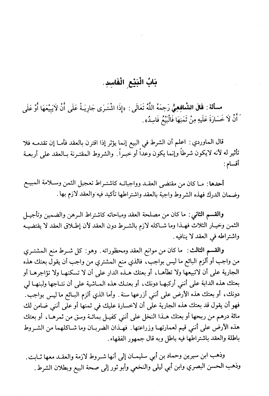 وَالْقِسْمُ الثَّالِثُ: مَا كَانَ مِنْ مَوَانِعِ الْعَقْدِ وَمَحْظُورَاتِهِ. وَهُوَ: كُلُّ شَرْطٍ مَنَعَ الْمُشْتَرِيَ مِنْ وَاجِبٍ أَوْ أَلْزَمَ الْبَائِعَ مَا لَيْسَ بِوَاجِبٍ، فَالَّذِي مَنَعَ الْمُشْتَرِيَ مِنْ وَاجِبٍ أَنْ يَقُولَ بِعْتُكَ هَذِهِ الْجَارِيَةَ عَلَى أَنْ لَا تَبِيعَهَا وَلَا تَطَأَهَا، أَوْ بِعْتُكَ هَذِهِ الدَّارَ عَلَى أَنْ لَا تَسْكُنَهَا وَلَا تُؤَاجِرَهَا أَوْ بِعْتُكَ هَذِهِ الدَّابَّةَ عَلَى أَنَّنِي أَرْكَبُهَا دُونَكَ، أَوْ بِعْتُكَ هَذِهِ الْمَاشِيَةَ عَلَى أَنَّ نِتَاجَهَا وَلَبَنَهَا لِي دُونَكَ، أَوْ بِعْتُكَ هَذِهِ الْأَرْضَ عَلَى أَنَّنِي أَزْرَعُهَا سَنَةً. وَأَمَّا الَّذِي أَلْزَمَ الْبَائِعَ مَا لَيْسَ بِوَاجِبٍ. فَهُوَ أَنْ يَقُولَ قَدْ بِعْتُكَ هَذِهِ الْجَارِيَةَ عَلَى أَنْ لَا خَسَارَةَ عَلَيْكَ فِي ثَمَنِهَا أَوْ عَلَى أَنَّنِي ضَامِنٌ لَكَ مِائَةَ دِرْهَمٍ مِنْ رِبْحِهَا أَوْ بِعْتُكَ هَذَا النَّخْلَ عَلَى أَنَّنِي كَفِيلٌ بِمِائَةِ وَسَقٍ مِنْ ثَمَرِهَا، أَوْ بِعْتُكَ هَذِهِ الْأَرْضَ على أنني قيم لعمارتها وَزِرَاعَتِهَا. فَهَذَانِ الضَّرْبَانِ وَمَا شَاكَلَهُمَا مِنَ الشُّرُوطِ بَاطِلَةٌ وَالْعَقْدُ بِاشْتِرَاطِهَا فِيهِ بَاطِلٌ وَبِهِ قَالَ جُمْهُورُ الْفُقَهَاءِ.