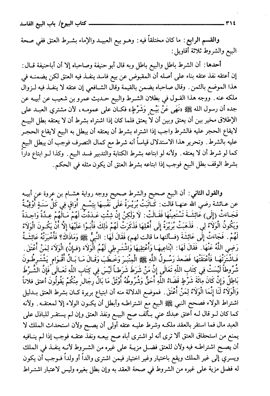 وَالْقَوْلُ الثَّانِي: أن البيع صحيح والشرط صحيح ووجه رِوَايَةُ هِشَامُ بْنُ عُرْوَةَ عَنْ أَبِيهِ عَنْ عَائِشَةَ رَضِيَ اللَّهُ عَنْهَا قَالَتْ: كَاتَبَتْ بَرِيرَةُ عَلَى نَفْسِهَا بِتِسْعِ أَوَاقٍ فِي كُلِّ سَنَةٍ أُوقِيَّةٌ فَجَاءَتْ (إِلَى) عَائِشَةَ تَسْتَعِينُهَا فَقَالَتْ: لَا وَلَكِنْ إِنْ شِئْتِ عَدَدْتُ لَهُمْ مَالَهُمْ عَدَةً وَاحِدَةً وَيَكُونُ الْوَلَاءُ لِي. فَذَهَبَتْ بَرِيرَةُ إِلَى أَهْلِهَا فَذَكَرَتْ لَهُمْ ذَلِكَ فَأَبَوْا عَلَيْهَا إِلَّا أَنْ يَكُونَ الْوَلَاءُ لَهُمْ. فَجَاءَتْ إِلَى عَائِشَةَ (فَسَأَلَتْهَا مَا قَالَتْ لَهُمْ) فَقَالَ لَهَا النَّبِيُّ - صَلَّى اللَّهُ عَلَيْهِ وَسَلَّم َ - وما ذاك؟ أخبرته عَائِشَةُ رَضِيَ اللَّهُ عَنْهَا. فَقَالَ لَهَا ابْتَاعِيهَا وَأَعْتِقِيهَا وَاشْتَرِطِي لَهُمُ الْوَلَاءَ (فَإِنَّ) الْوَلَاءَ لِمَنْ أَعْتَقَ. فَاشْتَرَتْهَا فَأَعْتَقَتْهَا فَصَعِدَ رَسُولُ اللَّهِ - صَلَّى اللَّهُ عَلَيْهِ وَسَلَّم َ - الْمِنْبَرَ وَخَطَبَ وَقَالَ مَا بَالُ أَقْوَامٍ يَشْتَرِطُونَ شُرُوطًا لَيْسَتْ فِي كِتَابِ اللَّهِ تَعَالَى إِنَّ مَنْ شَرَطَ شَرْطًا لَيْسَ فِي كِتَابِ اللَّهِ تَعَالَى فَإِنَّ الشَّرْطَ بَاطِلٌ وَإِنْ كَانَ مِائَةَ شَرْطٍ قَضَاءُ اللَّهِ أَحَقُّ وَشُرُوطُهُ أَوْثَقُ مَا بَالُ رِجَالٍ مِنْكُمْ يَقُولُونَ أَعْتِقْ فُلَانًا وَالْوَلَاءُ لَنَا إِنَّمَا الْوَلَاءُ لِمَنْ أَعْتَقَ. فَمَوْضِعُ الدَّلَالَةِ مِنْهُ أَنَّ ابْتِيَاعَ بَرِيرَةَ كَانَ بِشَرْطِ الْعِتْقِ بِدَلِيلِ اشْتِرَاطِ الْوَلَاءِ فَصَحَّحَ النَّبِيُّ - صَلَّى اللَّهُ عَلَيْهِ وَسَلَّم َ - الْبَيْعَ مَعَ اشْتِرَاطِهِ وَأَبْطَلَ أَنْ يَكُونَ الْوَلَاءُ إِلَّا لِمُعْتِقِهِ. وَلِأَنَّهُ كَمَا كَانَ لَوْ قَالَ لَهُ أَعْتِقْ عَبْدَكَ عَنِّي بِأَلْفٍ صَحَّ الْبَيْعُ وَنَفَذَ الْعِتْقُ وَإِنْ لَمْ يَسْتَقِرَّ لِلْبَاذِلِ عَلَى الْعَبْدِ مَالٌ فَمَا اسْتَقَرَّ بِالْعَقْدِ مَلَكَهُ وَشَرَطَ عَلَيْهِ عِتْقَهُ أَوْلَى أَنْ يَصِحَّ وَلِأَنَّ اسْتِحْدَاثَ الْمِلْكِ لَا يَمْنَعُ مِنِ اسْتِحْقَاقِ الْعِتْقِ أَلَا تَرَى أَنَّهُ لَوِ اشْتَرَى أَبَاهُ صَحَّ بَيْعُهُ ونفذ عتقه فوجب إذا لم ينافيه أَنْ يَصِحَّ اشْتِرَاطُهُ فِيهِ وَلِأَنَّ لِلْعِتْقِ فَضْلُ مَزِيَّةٍ عَلَى غَيْرِهِ مِنَ الشُّرُوطِ لِأَنَّهُ يَنْفُذُ فِي الْمِلْكِ وَيَسْرِي إِلَى غَيْرِ الْمِلْكِ وَيَقَعُ بِاخْتِيَارٍ وَغَيْرِ اخْتِيَارٍ فِيمَنِ اشْتَرَى وَالِدًا أَوْ ولدا فَوَجَبَ أَنْ يَكُونَ لَهُ فَضْلُ مَزِيَّةٍ عَلَى غَيْرِهِ مِنَ الشُّرُوطِ فِي صِحَّةِ الْعَقْدِ بِهِ وَإِنْ بَطَلَ بِغَيْرِهِ وَلَيْسَ لِاعْتِبَارِ اشْتِرَاطِ