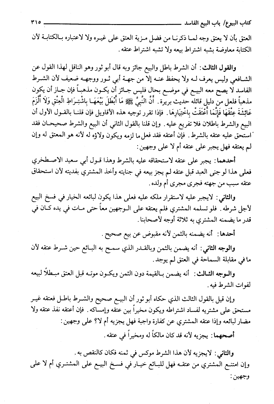 وَالْقَوْلُ الثَّالِثُ: أَنَّ الشَّرْطَ بَاطِلٌ وَالْبَيْعَ جَائِزٌ وَبِهِ قَالَ أَبُو ثَوْرٍ وَهُوَ النَّاقِلُ لِهَذَا الْقَوْلِ عَنِ الشَّافِعِيِّ وَلَيْسَ يُعْرَفُ لَهُ وَلَا يُحْفَظُ عَنْهُ إِلَّا مِنْ جِهَةِ أَبِي ثَوْرٍ وَوَجْهُهُ ضَعِيفٌ لِأَنَّ الشَّرْطَ الْفَاسِدَ لَا يَصِحُّ مَعَهُ البيع في موضع بحال فليس جائز أن يكون مذهبا فَإِنْ جَازَ أَنْ يَكُونَ مَذْهَبًا فَلَعَلَّ مِنْ دَلِيلِ قَائِلِهِ حَدِيثَ بَرِيرَةَ. أَنَّ النَّبِيَّ - صَلَّى اللَّهُ عَلَيْهِ وَسَلَّم َ - مَا أَبْطَلَ بَيْعَهَا بِاشْتِرَاطِ الْعِتْقِ وَلَا أَلْزَمَ عائشة عتقها فإنما أُعْتِقَتْ بِاخْتِيَارِهَا. فَإِذَا تَقَرَّرَ تَوْجِيهُ هَذِهِ الْأَقَاوِيلِ فَإِنْ قُلْنَا بِالْقَوْلِ الْأَوَّلِ إنَّ الْبَيْعَ وَالشَّرْطَ بَاطِلَانِ فَلَا تَفْرِيعَ عَلَيْهِ. وَإِنْ قُلْنَا بِالْقَوْلِ الثَّانِي إنَّ الْبَيْعَ وَالشَّرْطَ صَحِيحَانِ فَقَدِ اسْتَحَقَّ عَلَيْهِ عِتْقَهُ بِالشَّرْطِ. فَإِنْ أَعْتَقَهُ فَقَدْ فَعَلَ ما لزمه ويكون ولاؤه لَهُ لِأَنَّهُ هُوَ الْمُعْتِقُ لَهُ وَإِنْ لَمْ يُعْتِقْهُ فَهَلْ يُجْبَرُ عَلَى عِتْقِهِ أَمْ لَا عَلَى وَجْهَيْنِ: