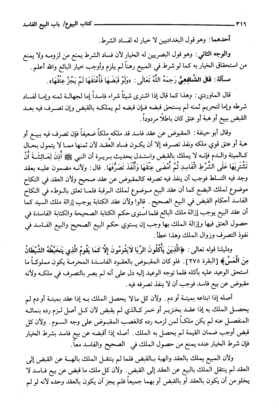 وَدَلِيلُنَا قَوْله تَعَالَى: {الَّذِينَ يَأْكُلُونَ الرِّبَا لا يَقُومُونَ إِلا كَمَا يَقُومُ الَّذِي يَتَخَبَّطُهُ الشَّيْطَانُ مِنَ الْمَسِّ} [البقرة: 275] . فَلَوْ كَانَ الْمَقْبُوضُ بالعقود الفاسدة المحرمة يكون مملوكا ما اسْتَحَقَّ الْوَعِيدَ عَلَيْهِ بِأَكْلِهِ فَلَمَّا تَوَجَّهَ الْوَعِيدُ إِلَيْهِ دَلَّ عَلَى أَنَّهُ لَمْ يصِر بِالتَّصَرُّفِ في مِلْكِهِ وَلِأَنَّهُ مَقْبُوضٌ عَنْ بَيْعٍ فَاسِدٍ فَوَجَبَ أَنْ لَا يَنْفُذَ تَصَرُّفُهُ فِيهِ.