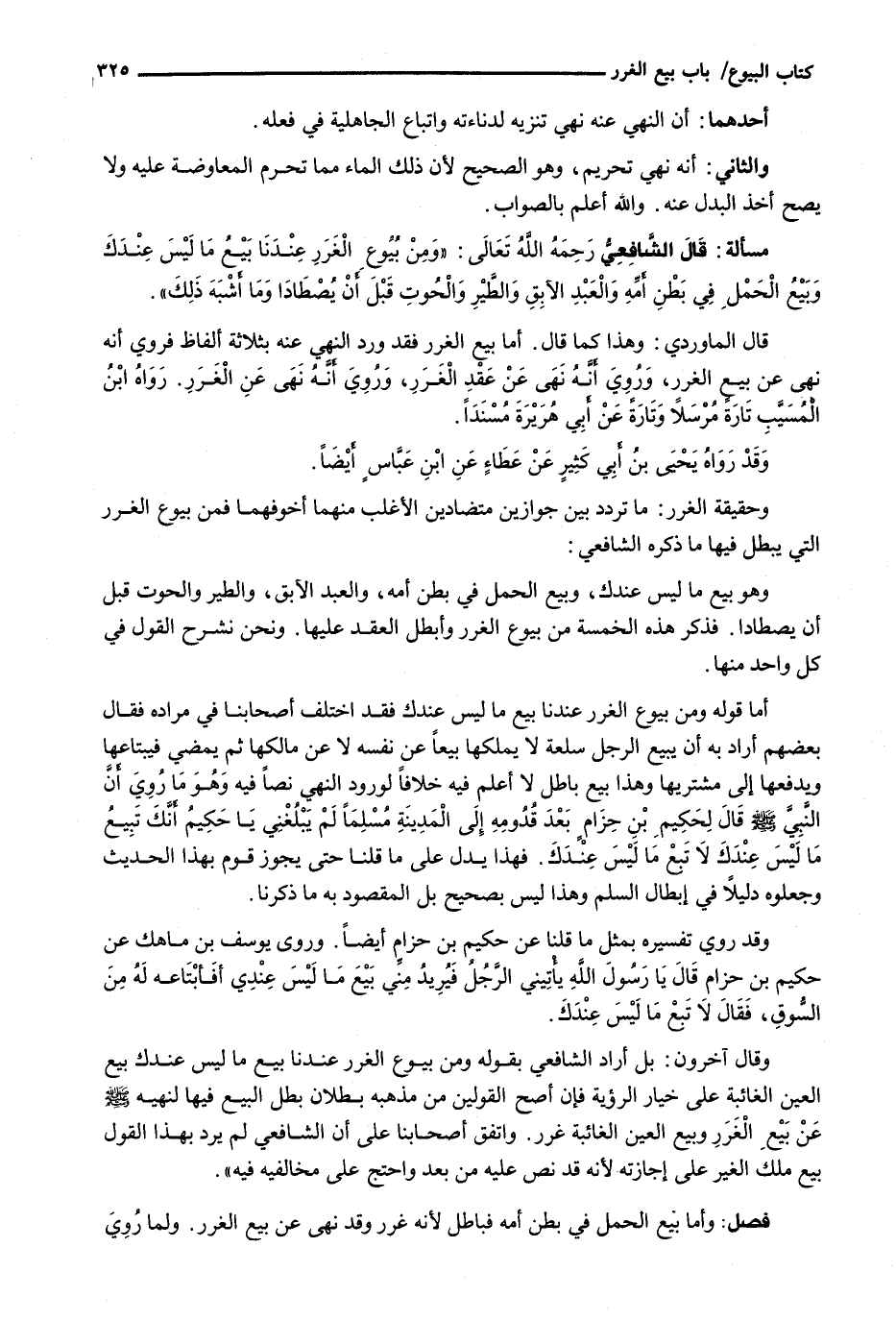 قال الشافعي رحمه الله تعالى: " وَمِنْ بُيُوعِ الْغَرَرِ عِنْدَنَا بَيْعُ مَا لَيْسَ عِنْدَكَ وَبَيْعُ الْحَمْلِ فِي بَطْنِ أُمِّهِ وَالْعَبْدِ الآبق والطير والحوت قبل أن يصطادا وَمَا أَشْبَهَ ذَلِكَ ".