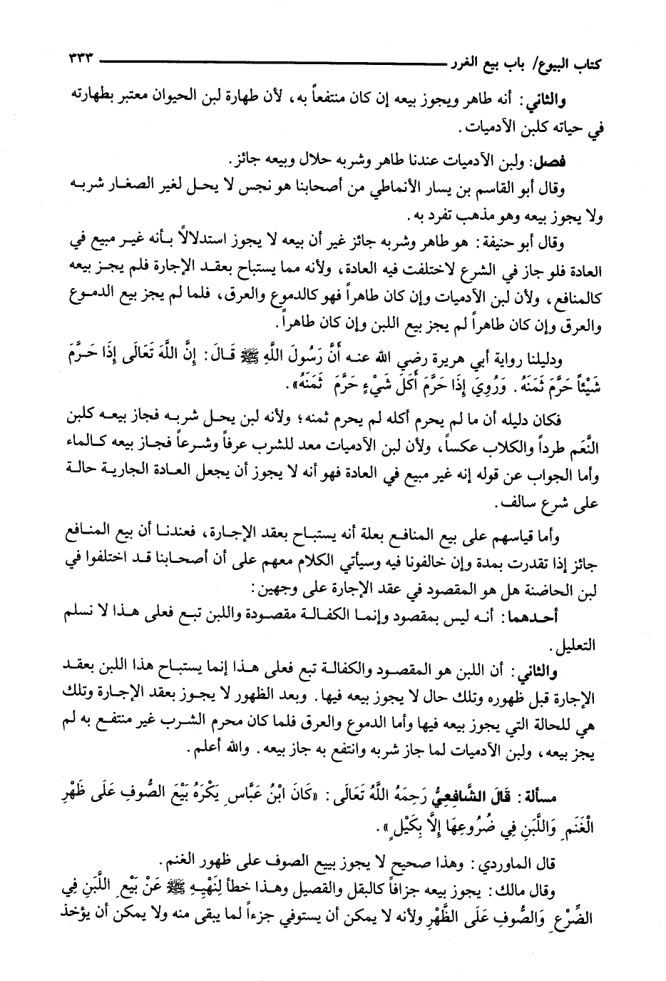 قال الشافعي رحمه الله تعالى: " كَانَ ابْنُ عَبَّاسٍ يَكْرَهُ بَيْعَ الصُّوفِ عَلَى ظَهْرِ الْغَنَمِ وَاللَّبَنِ فِي ضُرُوعِهَا إِلَّا بِكَيْلٍ ".
