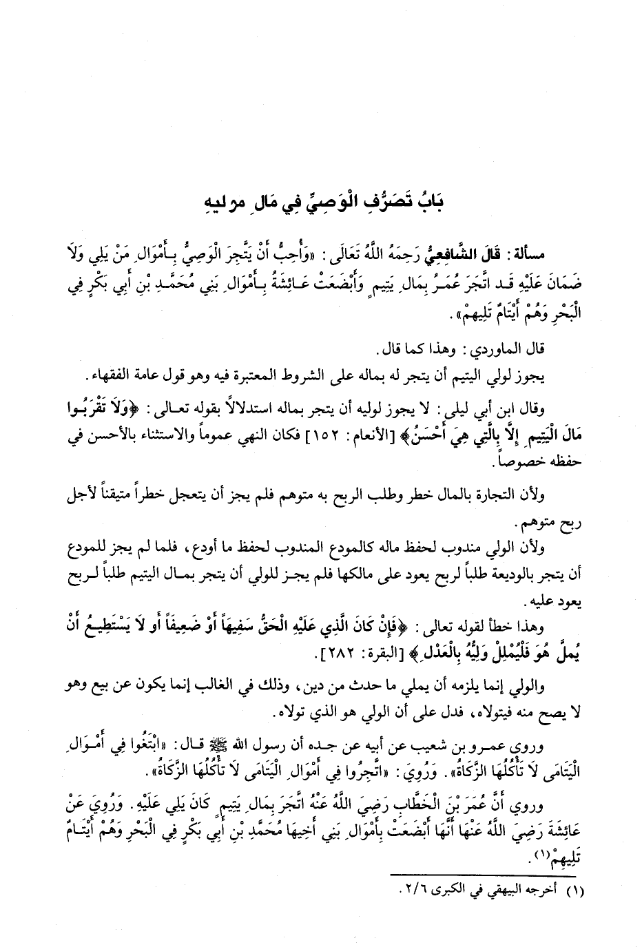 قال الشافعي رحمه الله تعالى: " وَأُحِبُّ أَنْ يَتَّجِرَ الْوَصِيُّ بِأَمْوَالِ مَنْ يَلِي وَلَا ضَمَانَ عَلَيْهِ قَدِ اتَّجَرَ عُمَرُ بِمَالِ يَتِيمٍ وَأَبْضَعَتْ عَائِشَةُ بِأَمْوَالِ بَنِي مُحَمَّدِ بْنِ أَبِي بَكْرٍ فِي الْبَحْرِ وَهُمْ أَيْتَامٌ تَلِيهِمْ ".