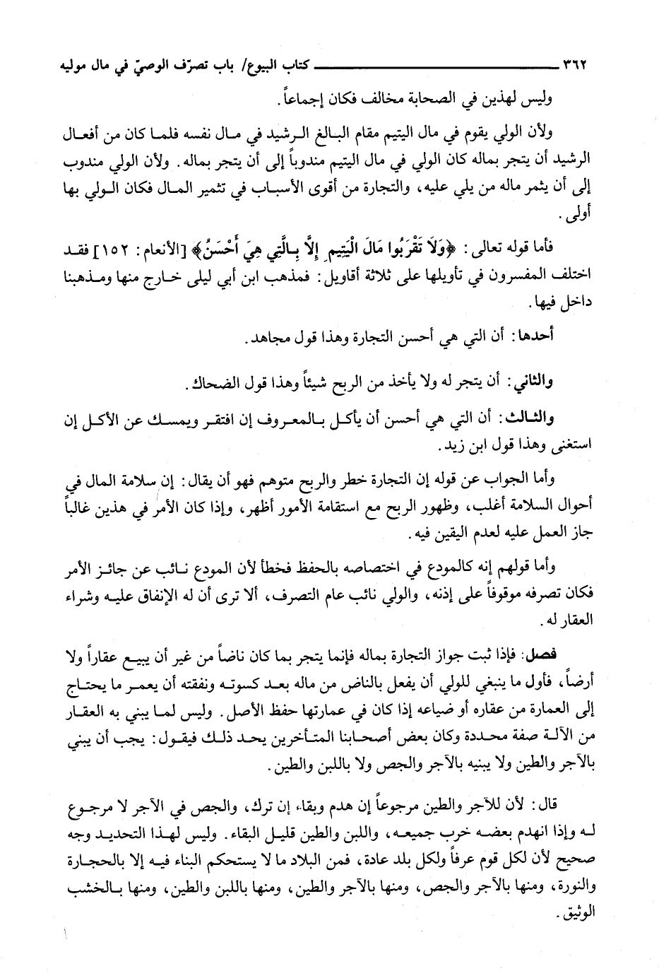 فَأَمَّا قَوْله تَعَالَى: {وَلا تَقْرَبُوا مَالَ الْيَتِيمِ إِلا بِالَّتِي هِيَ أَحْسَنُ} [الأنعام: 152] فَقَدِ اخْتَلَفَ الْمُفَسِّرُونَ فِي تَأْوِيلِهَا عَلَى ثَلَاثَةِ أَقَاوِيلَ: فَمَذْهَبُ ابْن أَبِي لَيْلَى خَارِجٌ مِنْهَا وَمَذْهَبُنَا دَاخِلٌ فِيهَا.