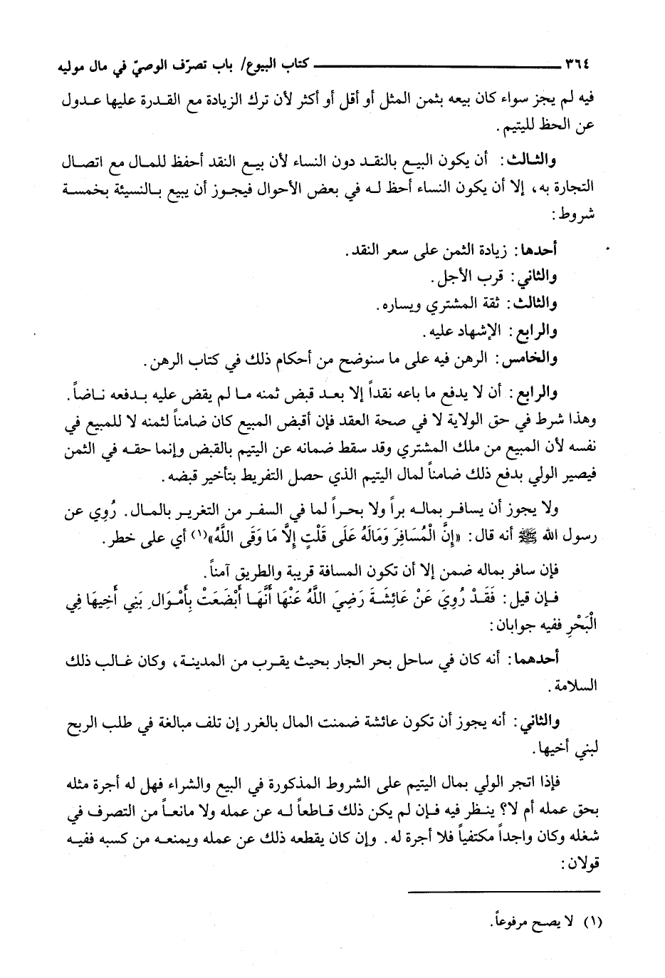 وَالثَّالِثُ: أَنْ يَكُونَ الْبَيْعُ بِالنَّقْدِ دُونَ النّسَاءِ لِأَنَّ بَيْعَ النَّقْدِ أَحْفَظُ لِلْمَالِ مَعَ اتِّصَالِ التِّجَارَةِ بِهِ، إِلَّا أَنْ يَكُونَ النّسَاءُ أَحَظَّ لَهُ فِي بَعْضِ الْأَحْوَالِ فَيَجُوزُ أَنْ يَبِيعَ بِالنَّسِيئَةِ بِخَمْسَةِ شُرُوطٍ: