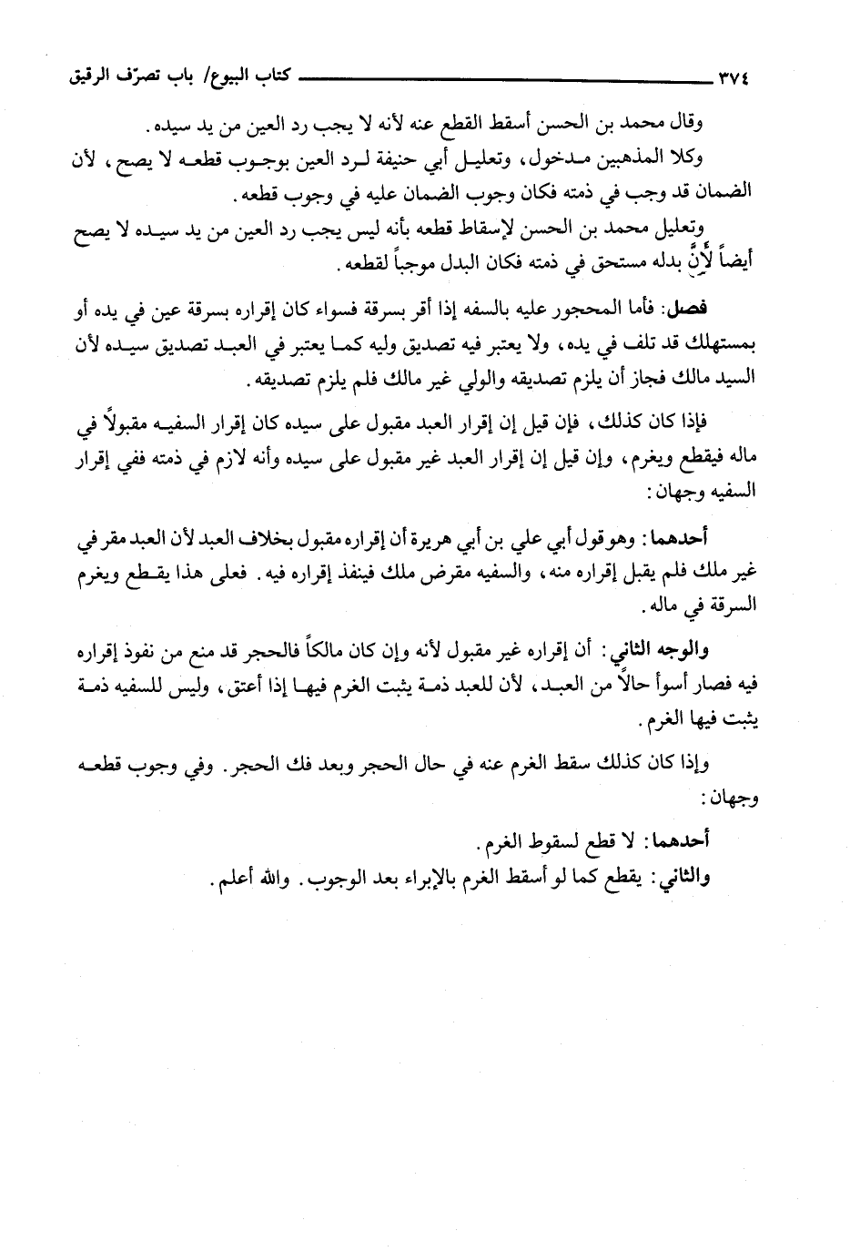 فَإِذَا كَانَ كَذَلِكَ، فَإِنْ قِيلَ إِنَّ إِقْرَارَ الْعَبْدِ مَقْبُولٌ عَلَى سَيِّدِهِ كَانَ إِقْرَارُ السَّفِيهِ مَقْبُولًا فِي مَالِهِ فَيُقْطَعُ وَيُغَرَّمُ، وَإِنْ قِيلَ إِنْ إِقْرَارَ الْعَبْدِ غَيْرُ مَقْبُولٍ عَلَى سَيِّدِهِ وَأَنَّهُ لَازِمٌ فِي ذِمَّتِهِ فَفِي إِقْرَارِ السَّفِيهِ وَجْهَانِ: