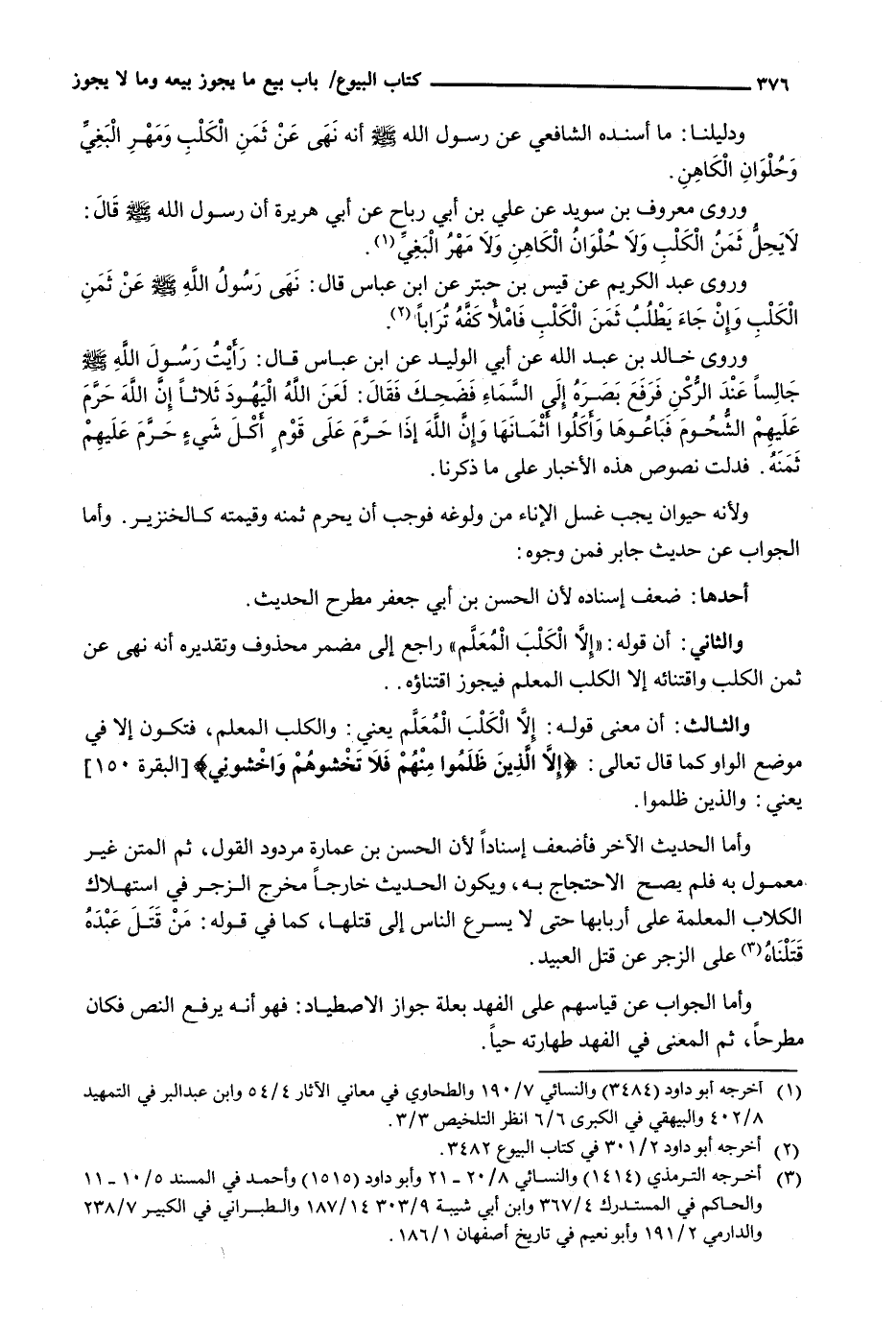 وَلِأَنَّهُ حَيَوَانٌ يَجِبُ غَسْلُ الْإِنَاءِ مِنْ وُلُوغِهِ فَوَجَبَ أَنْ يَحْرُمَ ثَمَنُهُ وَقِيمَتُهُ كَالْخِنْزِيرِ. وَأَمَّا الْجَوَابُ عَنْ حَدِيثِ جَابِرٍ فَمِنْ وُجُوهٍ: