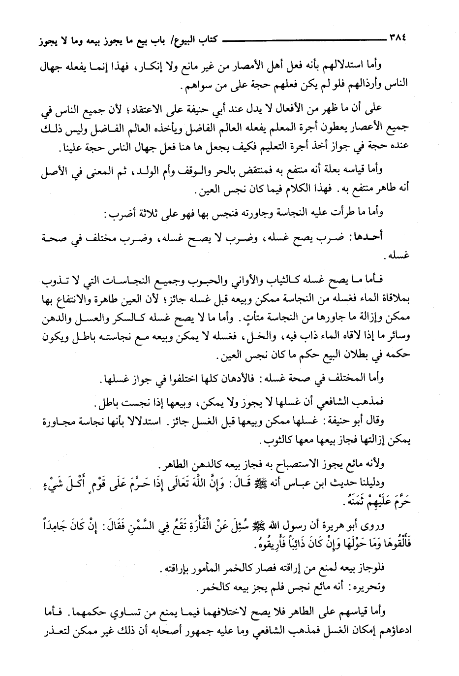 فَأَمَّا مَا يَصِحُّ غَسْلُهُ كَالثِّيَابِ وَالْأَوَانِي وَالْحُبُوبِ وَجَمِيعِ النَّجَاسَاتِ الَّتِي لَا تَذُوبُ بِمُلَاقَاةِ الْمَاءِ فَغَسْلُهُ مِنَ النَّجَاسَةِ مُمْكِنٌ وَبَيْعُهُ قَبْلَ غَسْلِهِ جَائِزٌ؛ لِأَنَّ الْعَيْنَ طَاهِرَةٌ وَالِانْتِفَاعُ بِهَا مُمْكِنٌ وَإِزَالَةُ مَا جَاوَرَهَا مِنَ النَّجَاسَةِ مُتَأَتٍّ. وَأَمَّا مَا لَا يَصِحُّ غَسْلُهُ كَالسُّكَّرِ وَالْعَسَلِ وَالدُّهْنِ وَسَائِرِ مَا إِذَا لَاقَاهُ الْمَاءُ ذَابَ فِيهِ، وَالْخَلُّ، فَغَسْلُهُ لَا يُمْكِنُ وَبَيْعُهُ مَعَ نَجَاسَتِهِ بَاطِلٌ وَيَكُونُ حُكْمُهُ فِي بُطْلَانِ الْبَيْعِ حُكْمُ مَا كَانَ نَجِسَ الْعَيْنِ.