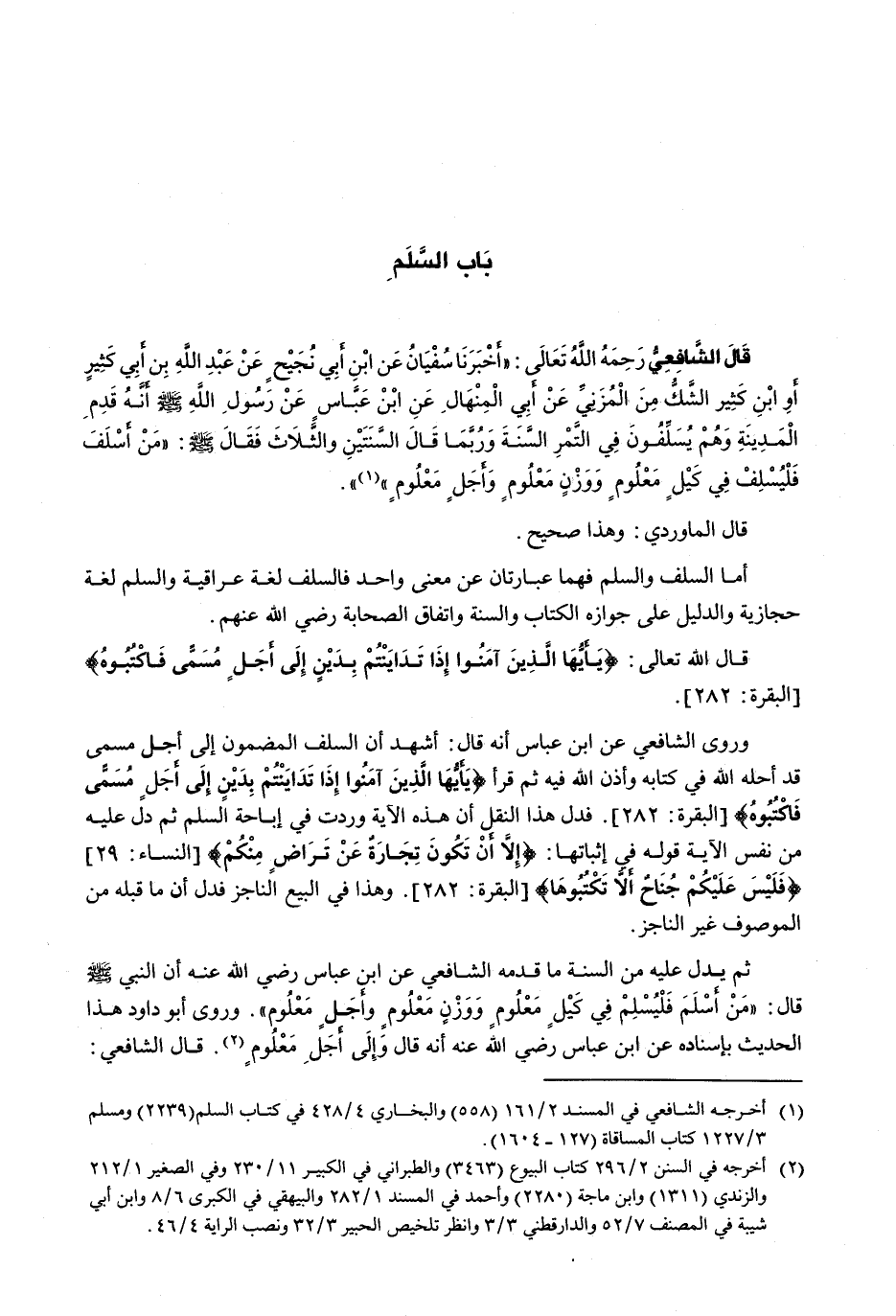 قَالَ الشَّافِعِيُّ رَحِمَهُ اللَّهُ تَعَالَى: أَخْبَرَنَا سُفْيَانُ عَنِ ابْنِ أَبِي نَجِيحٍ عَنْ عَبْدِ اللَّهِ بن أبي كثير أو ابن كثير الشك من المزني عَنْ أَبِي الْمِنْهَالِ عَنِ ابْنُ عَبَّاسٍ عَنْ رَسُولِ اللَّهِ - صَلَّى اللَّهُ عَلَيْهِ وَسَلَّم َ - أَنَّهُ قَدِمَ الْمَدِينَةَ وَهُمْ يُسَلِّفُونَ فِي التَّمْرِ السَّنَةَ وَرُبَّمَا قَالَ السَّنَتَيْنِ وَالثَّلَاثَ فَقَالَ - صَلَّى اللَّهُ عَلَيْهِ وَسَلَّم َ -: " مَنْ أَسْلَفَ فَلْيُسْلِفْ فِي كَيْلٍ مَعْلُومٍ وَوَزْنٍ معلوم وأجل مَعْلُومٍ ".