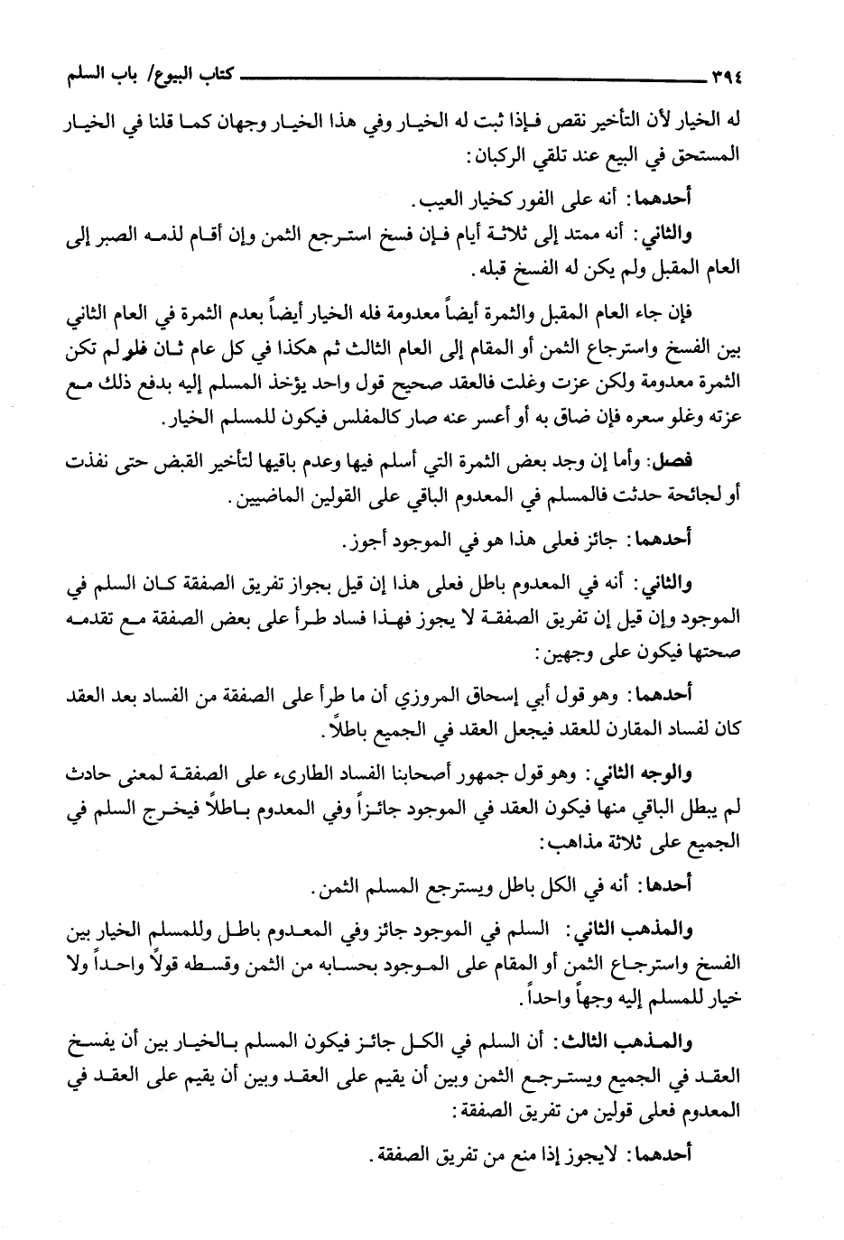 وَالْمَذْهَبُ الثَّالِثُ: أَنَّ السَّلَمَ فِي الْكُلِّ جَائِزٌ فَيَكُونُ الْمُسَلَّمُ بِالْخِيَارِ بَيْنَ أَنْ يَفْسَخَ الْعَقْدَ فِي الْجَمِيعِ وَيَسْتَرْجِعَ الثَّمَنَ وبين أن يقيم على العقد وَبَيْنَ أَنْ يُقِيمَ عَلَى الْعَقْدِ فِي الْمَعْدُومِ فَعَلَى قَوْلَيْنِ مِنْ تَفْرِيقِ الصَّفْقَةِ: