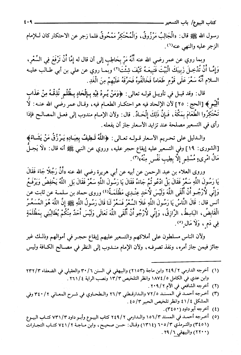 وَرَوَى الْعَلَاءُ بْنُ عَبْدِ الرَّحْمَنِ عَنْ أَبِيهِ عَنْ أَبَى هُرَيْرَةَ رَضِيَ اللَّهُ عَنْهُ: " أَنَّ رَجُلًا جَاءَ فَقَالَ يَا رَسُولَ اللَّهِ سَعِّرْ فَقَالَ بَلْ أَدْعُو ثُمَّ جَاءَهُ فَقَالَ يَا رَسُولَ اللَّهِ سَعِّرْ فَقَالَ بَلِ اللَّهُ يَخْفِضُ وَيَرْفَعُ وَإِنِّي لَأَرْجُو أَنْ أَلْقَى اللَّهَ وَلَيْسَ لِأَحَدٍ عِنْدِي مَظْلَمَةٌ "، وَرَوَى حَمَّادُ بْنُ سَلَمَةَ عَنْ ثَابِتٍ عَنْ أَنَسٍ قَالَ: قَالَ النَّاسُ يَا رَسُولَ اللَّهِ غَلَا السِّعْرُ فَسَعِّرْ لَنَا، قَالَ رَسُولُ اللَّهِ - صَلَّى اللَّهُ عَلَيْهِ وَسَلَّم َ - إِنَّ اللَّهَ هُوَ الْمُسَعِّرُ الْقَابِضُ، الْبَاسِطُ، الرَّازِقُ، وَإِنِّي لَأَرْجُو أَنْ أَلْقَى اللَّهَ تَعَالَى وَلَيْسَ أَحَدٌ مِنْكُمْ يُطَالِبُنِي بِمَظْلَمَةٍ فِي دَمٍ، وَلَا مال.