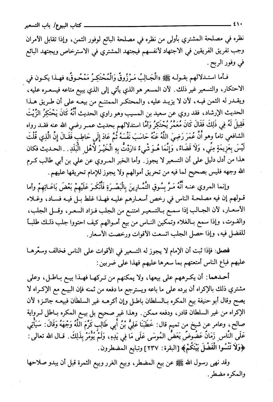 فَأَمَّا اسْتِدْلَالُهُمْ بِقَوْلِهِ - صَلَّى اللَّهُ عَلَيْهِ وَسَلَّم َ -: " الجالب مرزوق والمحتكر ممحوق " فَهَذَا يَكُونُ فِي الِاحْتِكَارِ، وَالتَّسْعِيرُ غَيْرُ ذَلِكَ. لِأَنَّ الْمُسَعِّرَ هُوَ الَّذِي يَأْتِي إِلَى الَّذِي يَبِيعُ مَتَاعَهُ فَيُسَعِّرُهُ عَلَيْهِ، وَيُقَدِّرُ لَهُ الثَّمَنَ فيه، لأن لا يزيد عليه، والمحتكر الممتنع من بيعه على أَنَّ طَرِيقَ هَذَا الْحَدِيثِ الْإِرْشَادُ، فَقَدْ رُوِيَ عَنْ سَعِيدِ بْنِ الْمُسَيَّبِ وَهُوَ رَاوِي الْحَدِيثِ أَنَّهُ كَانَ يَحْتَكِرُ الزَّيْتَ فَقِيلَ لَهُ فِي ذَلِكَ فَقَالَ كَانَ مَعْمَرُ يَحْتَكِرُ وَأَمَّا اسْتِدْلَالُهُمْ بِحَدِيثِ عُمَرَ رَضِيَ اللَّهُ عَنْهُ فَقَدْ رَوَاهُ الشَّافِعِيُّ تَامًّا وَهُوَ أَنَّ عُمَرَ رَضِيَ اللَّهُ عَنْهُ حَاسَبَ نَفْسَهُ ثُمَّ عَادَ إِلَى حَاطِبٍ فَقَالَ إِنَّ الَّذِي قُلْتُ لَيْسَ بِعَزِيمَةٍ مِنِّي، وَلَا قَضَاءَ، وَإِنَمَا هُوَ شَيْءٌ أَرَدْتُ بِهِ الْخَيْرَ لِأَهْلِ الْبَلَدِ. . الْحَدِيثُ فَكَانَ هَذَا مِنْ أَدَلِّ دَلِيلٍ عَلَى أَنَّ التَّسْعِيرَ لَا يَجُوزُ. وَأَمَّا الْخَبَرُ الْمَرْوِيُّ عَنْ عَلِيِّ بْنِ أَبِي طَالِبٍ كَرَّمَ اللَّهُ وَجْهَهُ فَلَيْسَ بِصَحِيحٍ لِمَا فِيهِ مِنْ تَحْرِيقِ أَمْوَالِهِمْ وَلَا يَجُوزُ لِلْإِمَامِ تَحْرِيقُهَا عَلَيْهِمْ.