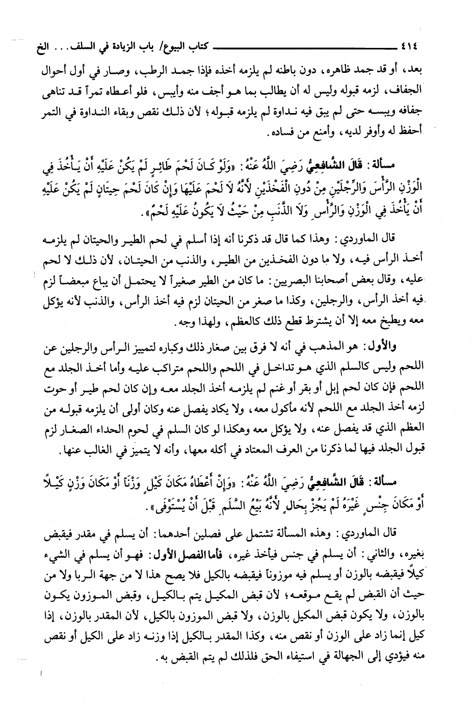 قال الشافعي رضي الله عنه: " وَلَوْ كَانَ لَحْمَ طَائِرٍ لَمْ يَكُنْ عَلَيْهِ أَنْ يَأْخُذَ فِي الْوَزْنِ الرَّأْسَ وَالرِّجْلَيْنِ مِنْ دُونِ الْفَخْذَيْنِ لِأَنَّهُ لَا لَحْمَ عَلَيْهَا وَإِنْ كَانَ لَحْمَ حِيتَانٍ لَمْ يَكُنْ عَلَيْهِ أَنْ يَأْخُذَ فِي الْوَزْنِ وَالرَّأْسِ وَلَا الذَّنَبِ مِنْ حَيْثُ لَا يَكُونُ عَلَيْهِ لَحْمٌ ". قَالَ الْمَاوَرْدِيُّ: وَهَذَا كَمَا قَالَ قَدْ ذَكَرْنَا أَنَّهُ إِذَا أَسْلَمَ فِي لَحْمِ الطَّيْرِ وَالْحِيتَانِ لَمْ يَلْزَمْهُ أَخْذُ الرَّأْسِ فِيهِ، وَلَا مَا دُونَ الْفَخْذَيْنِ مِنَ الطَّيْرِ، وَالذَّنَبِ مِنَ الْحِيتَانِ، لِأَنَّ ذَلِكَ لَا لَحْمَ عَلَيْهِ، وَقَالَ بَعْضُ أَصْحَابِنَا الْبَصْرِيِّينَ: مَا كَانَ مِنَ الطَّيْرِ صَغِيرًا لَا يَحْتَمِلُ أَنْ يُبَاعَ مُبَعَّضًا لَزِمَ فِيهِ أَخْذُ الرَّأْسِ، وَالرِّجْلَيْنِ، وَكَذَا مَا صَغُرَ مِنَ الْحِيتَانِ لَزِمَ فِيهِ أَخْذُ الرَّأْسِ، وَالذَّنَبِ لِأَنَّهُ يُؤْكَلُ مَعَهُ وَيُطْبَخُ مَعَهُ إِلَّا أَنْ يُشْتَرَطَ قَطْعُ ذَلِكَ كَالْعَظْمِ، وَلِهَذَا وَجْهٌ. وَالْأَوَّلُ: هُوَ الْمَذْهَبُ فِي أَنَّهُ لَا فَرْقَ بَيْنَ صِغَارِ ذَلِكَ وَكِبَارِهِ لِتَمْيِيزِ الرَّأْسِ وَالرِّجْلَيْنِ عَنِ اللَّحْمِ وَلَيْسَ كَالسَّلَمِ الَّذِي هُوَ تَدَاخُلٌ فِي اللَّحْمِ وَاللَّحْمُ مُتَرَاكِبٌ عَلَيْهِ وَأَمَّا أَخْذُ الْجِلْدِ مَعَ اللَّحْمِ فَإِنْ كَانَ لَحْمُ إِبِلٍ أَوْ بَقَرٍ أَوْ غَنَمٍ لَمْ يَلْزَمْهُ أَخْذُ الْجِلْدِ مَعَهُ وَإِنْ كَانَ لَحْمَ طَيْرٍ أَوْ حُوتٍ لَزِمَهُ أَخْذُ الْجِلْدِ مَعَ اللَّحْمِ لِأَنَّهُ مَأْكُولٌ مَعَهُ، وَلَا يَكَادُ يُفْصَلُ عَنْهُ وَكَانَ أَوْلَى أَنْ يَلْزَمَهُ قَبُولُهُ مِنَ الْعَظْمِ الَّذِي قَدْ يُفْصَلُ عَنْهُ، وَلَا يُؤْكَلُ مَعَهُ وَهَكَذَا لَوْ كَانَ السَّلَمُ فِي لُحُومِ الْحِدَاءِ الصِّغَارِ لَزِمَ قَبُولُ الْجِلْدِ فِيهَا لِمَا ذَكَرْنَا مِنَ الْعُرْفِ الْمُعْتَادِ فِي أَكْلِهِ مَعَهَا، وَأَنَّهُ لَا يَتَمَيَّزُ فِي الْغَالِبِ عَنْهَا.
