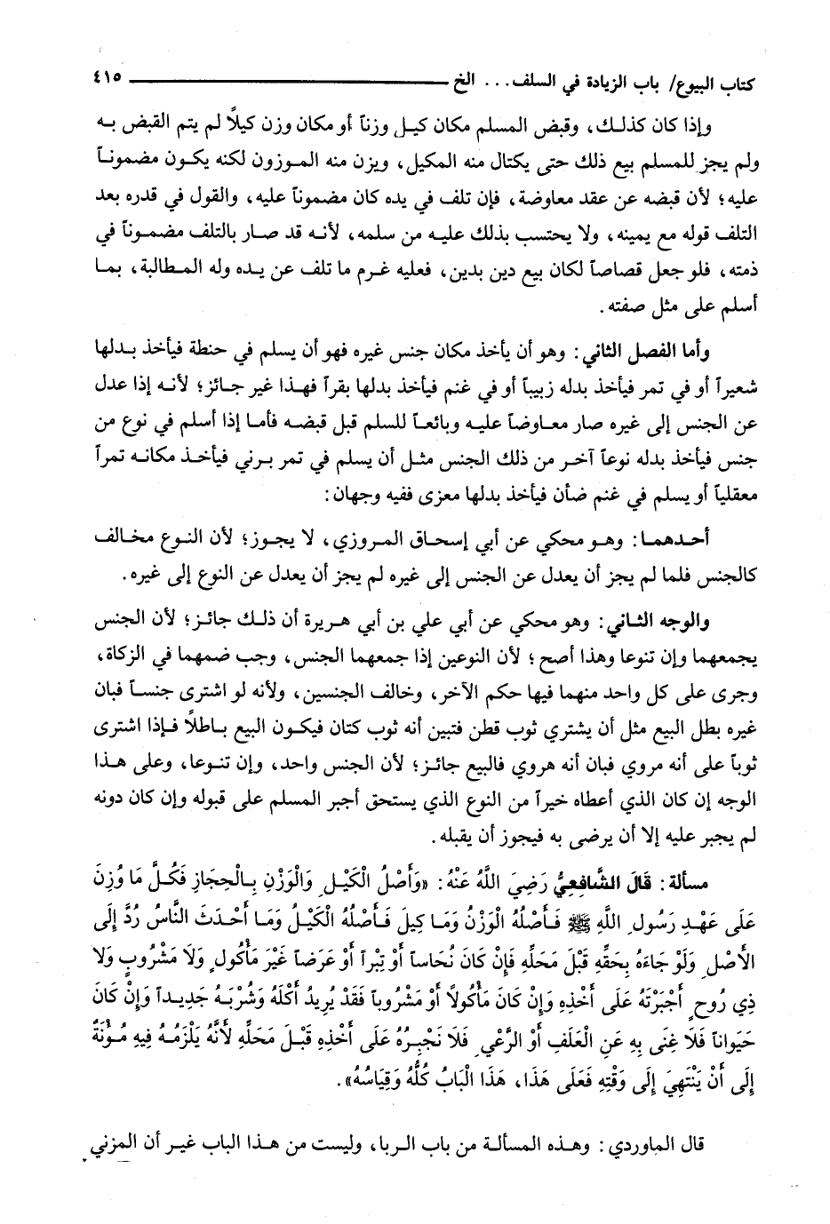 قَالَ الشافعي رضي الله عنه: " وَأَصْلُ الْكَيْلِ وَالْوَزْنِ بِالْحِجَازِ فَكُلُّ مَا وُزِنَ عَلَى عَهْدِ رَسُولِ اللَّهِ - صَلَّى اللَّهُ عَلَيْهِ وَسَلَّم َ - فَأَصْلُهُ الْوَزْنُ وَمَا كِيلَ فَأَصْلُهُ الْكَيْلُ وَمَا أحدث الناس رد إلى الأصل وَلَوْ جَاءَهُ بِحَقِّهِ قَبْلَ مَحَلِّهِ فَإِنْ كَانَ نُحَاسًا أَوْ تِبْرًا أَوْ عَرَضًا غَيْرَ مَأْكُولٍ وَلَا مَشْرُوبٍ وَلَا ذِي رُوحٍ أَجْبَرْتَهُ عَلَى أَخْذِهِ وَإِنْ كَانَ مَأْكُولًا أَوْ مَشْرُوبًا فَقَدْ يُرِيدُ أَكْلَهُ وَشُرْبَهُ جَدِيدًا وَإِنْ كَانَ حَيَوَانًا فَلَا غِنَى بِهِ عَنِ الْعَلْفِ أَوِ الرَّعْيِ فلا نجبره عَلَى أَخْذِهِ قَبْلَ مَحَلِّهِ لِأَنَّهُ يَلْزَمُهُ فِيهِ مُؤْنَةٌ إِلَى أَنْ يَنْتَهِيَ إِلَى وَقْتِهِ فَعَلَى هذا، هذا الباب كله وقياسه ".