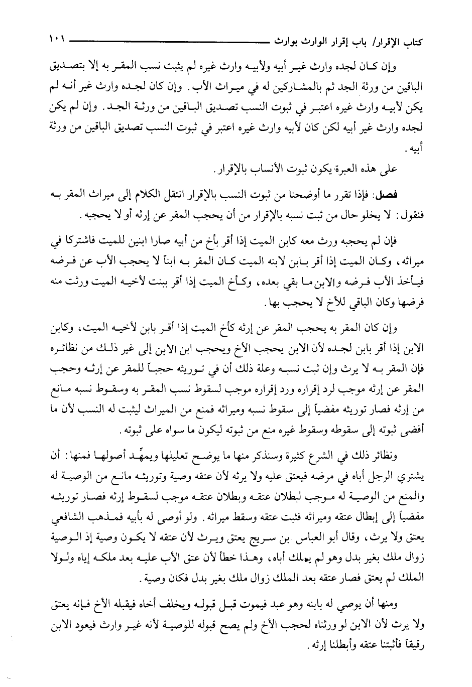 وَإِنْ كَانَ الْمُقَرُّ بِهِ يَحْجُبُ الْمُقِرَّ عَنْ إِرْثِهِ كَأَخِ الْمَيِّتِ إِذَا أَقَرَّ بِابْنٍ لِأَخِيهِ الْمَيِّتِ، وَكَابْنِ الِابْنِ إِذَا أَقَرَّ بِابْنٍ لِجَدِّهِ لِأَنَّ الِابْنَ يَحْجُبُ الْأَخَ وَيَحْجُبُ ابْنَ الِابْنِ إِلَى غَيْرِ ذَلِكَ مِنْ نَظَائِرِهِ فَإِنَّ الْمُقَرَّ بِهِ لَا يَرِثُ وَإِنْ ثَبَتَ نَسَبُهُ وَعِلَّةُ ذَلِكَ أَنَّ فِي تَوْرِيثِهِ حَجْبًا لِلْمُقِرِّ عَنْ إِرْثِهِ وَحَجْبُ الْمُقِرِّ عَنْ إِرْثِهِ مُوجِبٌ لِرَدِّ إِقْرَارِهِ وَرَدُّ إِقْرَارِهِ مُوجِبٌ لِسُقُوطِ نَسَبِ الْمُقَرِّ بِهِ وَسُقُوطُ نَسَبِهِ مَانِعٌ مِنْ إِرْثِهِ فَصَارَ تَوْرِيثُهُ مُفْضِيًا إِلَى سُقُوطِ نَسَبِهِ وَمِيرَاثِهِ فَمُنِعَ مِنَ الْمِيرَاثِ لِيَثْبُتَ لَهُ النَّسَبُ لِأَنَّ مَا أَفْضَى ثُبُوتُهُ إِلَى سُقُوطِهِ وَسُقُوطِ غَيْرِهِ مُنِعَ مِنْ ثُبُوتِهِ لِيَكُونَ مَا سِوَاهُ عَلَى ثُبُوتِهِ.