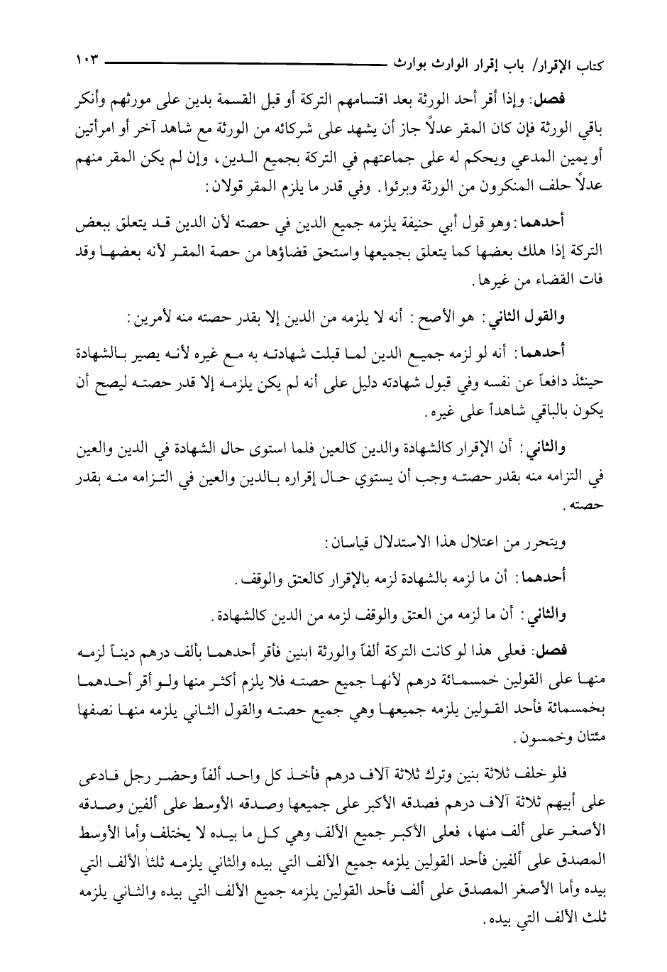 : وَإِذَا أَقَرَّ أَحَدُ الْوَرَثَةِ بَعْدَ اقْتِسَامِهِمُ التَّرِكَةَ أَوْ قَبْلَ الْقِسْمَةِ بِدَيْنٍ عَلَى مُوَرِّثِهِمْ وَأَنْكَرَ بَاقِي الْوَرَثَةِ فَإِنْ كَانَ الْمُقِرُّ عَدْلًا جَازَ أَنْ يَشْهَدَ عَلَى شُرَكَائِهِ مِنَ الْوَرَثَةِ مَعَ شَاهِدٍ آخَرَ أَوِ امْرَأَتَيْنِ أَوْ يَمِينِ الْمُدَّعِي وَيُحْكَمُ لَهُ عَلَى جَمَاعَتِهِمْ فِي التَّرِكَةِ بِجَمِيعِ الدَّيْنِ، وَإِنْ لَمْ يَكُنِ الْمُقِرُّ مِنْهُمْ عَدْلًا حَلَفَ الْمُنْكِرُونَ مِنَ الْوَرَثَةِ وَبَرِئُوا. وَفِي قَدْرِ مَا يَلْزَمُ الْمُقِرَّ قَوْلَانِ: