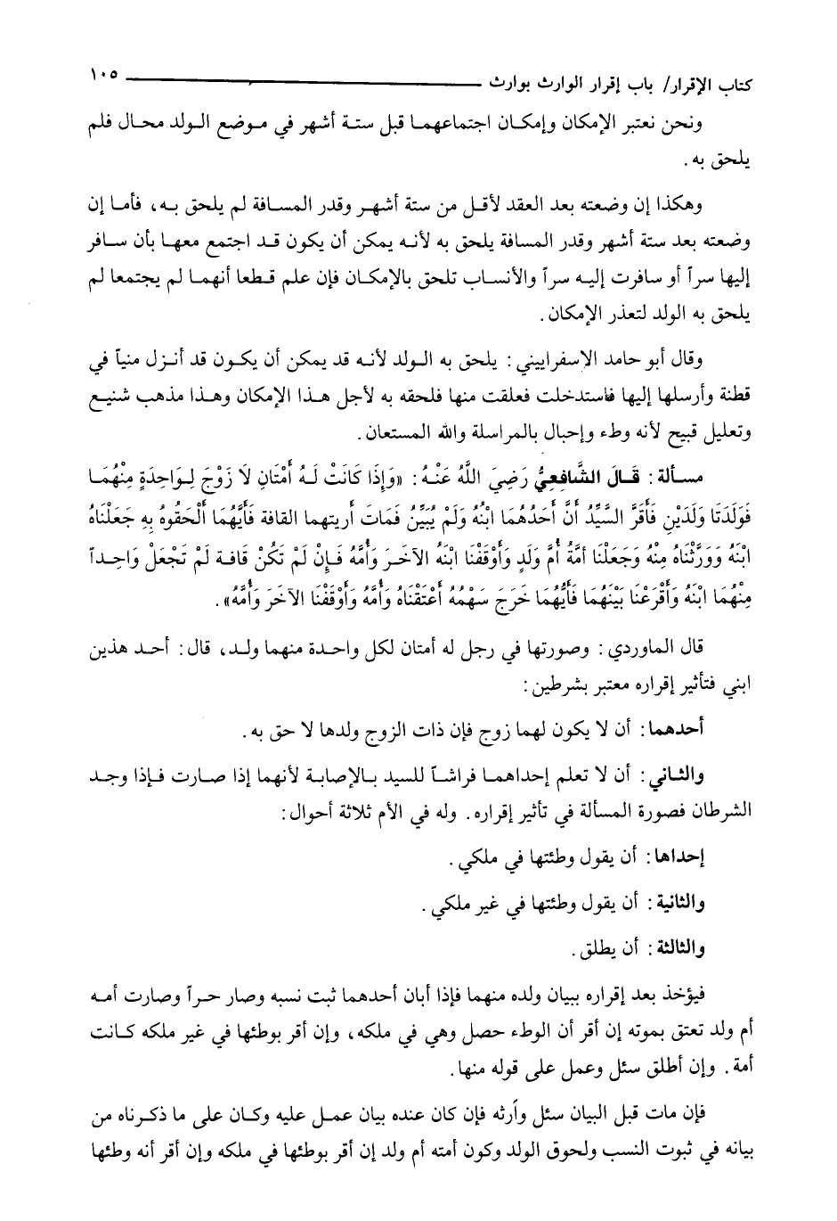 قال الشافعي رضي الله عنه: " وإذا كانت لَهُ أَمَتَانِ لَا زَوْجَ لواحدةٍ مِنْهُمَا فَوَلَدَتَا وَلَدَيْنِ فَأَقَرَّ السَّيِّدُ أَنَّ أَحَدَهُمَا ابْنُهُ وَلَمْ يُبَيِّنْ فَمَاتَ أَرَيْتُهُمَا الْقَافَةَ فَأَيُّهُمَا أَلْحَقُوهُ بِهِ جَعَلْنَاهُ ابْنَهُ وَوَرَّثْنَاهُ مِنْهُ وَجَعَلْنَا أُمَّهُ أُمَّ ولدٍ وأوقفنا ابنه الآخر وأمه فإن لم تكن قافة لم تجعل وَاحِدًا مِنْهُمَا ابْنَهُ وَأَقْرَعْنَا بَيْنَهُمَا فَأَيُّهُمَا خَرَجَ سَهْمُهُ أَعْتَقْنَاهُ وَأُمَّهُ وَأَوْقَفْنَا الْآخَرَ وَأُمَّهُ ".