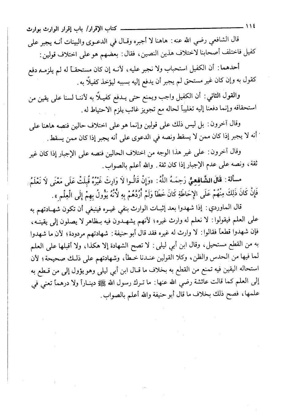 قَالَ الشَّافِعِيُّ رَحِمَهُ اللَّهُ: " وَإِنْ قَالُوا لَا وَارِثَ غَيْرُهُ قُبِلَتْ عَلَى مَعْنَى لَا نَعْلَمُ فَإِنْ كَانَ ذَلِكَ مِنْهُمْ عَلَى الْإِحَاطَةِ كَانَ خطاً ولم أردهم به لأنه يؤول بِهِمْ إِلَى الْعِلْمِ ".