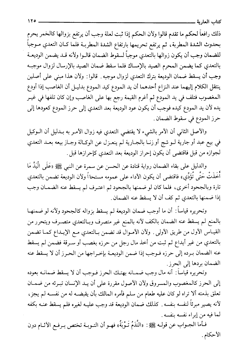 ذَلِكَ رَافِعًا لِحُكْمِ مَا تَقَدَّمَ قَالُوا وَلِأَنَّ الْحُكْمَ إِذَا ثَبَتَ لِعِلَّةٍ وَجَبَ أَنْ يَرْتَفِعَ بِزَوَالِهَا كَالْخَمْرِ يَحْرُمُ بِحُدُوثِ الشِّدَّةِ الْمُطْرِبَةِ، ثُمَّ يَرْتَفِعُ تَحْرِيمُهَا بِارْتِفَاعِ الشِّدَّةِ الْمُطْرِبَةِ فَلَمَّا كَانَ التَّعَدِّي مُوجِبًا لِلضَّمَانِ وَجَبَ أَنْ يَكُونَ زَوَالُهَا بِالتَّعَدِّي مُوجِبًا لِسُقُوطِ الضَّمَانِ قَالُوا وَلِأَنَّهُ قَدْ يَضْمَنُ الْوَدِيعَةَ بِالتَّعَدِّي كَمَا يَضْمَنُ الْمُحْرِمُ الصَّيْدَ بِالْإِمْسَاكِ فَلَمَّا سَقَطَ ضَمَانُ الصَّيْدِ بِالْإِرْسَالِ لِزَوَالِ مُوجِبِهِ وَجَبَ أَنْ يَسْقُطَ ضَمَانُ الْوَدِيعَةِ بِتَرْكِ التَّعَدِّي لِزَوَالِ مُوجِبِهِ. قَالُوا: وَلِأَنَّ هَذَا مَبْنِيٌّ عَلَى أَصْلَيْنِ يَنْتَقِلُ الْكَلَامُ إِلَيْهِمَا عِنْدَ النِّزَاعِ أَحَدُهُمَا أَنَّ يَدَ الْمُودَعِ كَيَدِ الْمُودِعِ بِدَلِيلِ أَنَّ الْغَاصِبَ إِذَا أَوْدَعَ الْمَغْصُوبَ فَتَلِفَ فِي يَدِ الْمُودَعِ ثُمَّ أُغْرِمَ الْقِيمَةَ رَجَعَ بِهَا عَلَى الْغَاصِبِ وَإِنْ كَانَ تَلَفُهَا فِي غَيْرِ يَدِهِ لِأَنَّ يَدَ الْمُودِعِ كَيْدِهِ فَوَجَبَ أَنْ يَكُونَ عَوْدُ الْوَدِيعَةِ بَعْدَ التَّعَدِّي إِلَى حِرْزِ الْمُودِعِ كَعَوْدِهَا إِلَى حِرْزِ الْمُودَعِ فِي سُقُوطِ الضَّمَانِ.