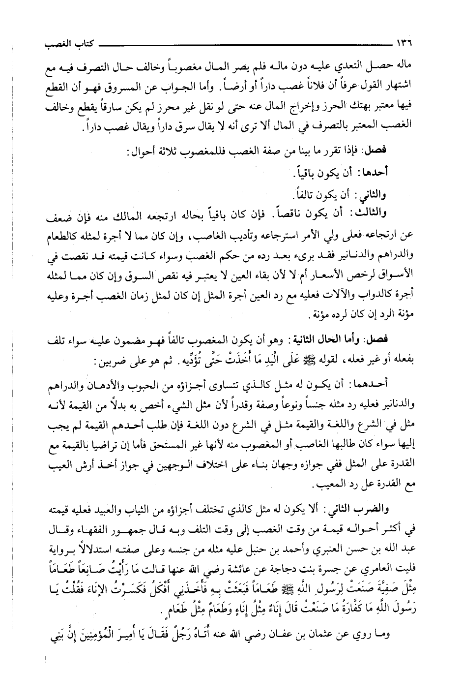 وَالضَّرْبُ الثَّانِي: أَلَّا يَكُونَ لَهُ مِثْلٌ كَالَّذِي تَخْتَلِفُ أَجْزَاؤُهُ مِنَ الثِّيَابِ وَالْعَبِيدِ فَعَلَيْهِ قِيمَتُهُ فِي أَكْثَرِ أَحْوَالِهِ قِيمَةً مِنْ وَقْتِ الْغَصْبِ إِلَى وَقْتِ التَّلَفِ وَبِهِ قَالَ جُمْهُورُ الْفُقَهَاءِ وَقَالَ عَبْدُ اللَّهِ بْنُ حَسَنٍ الْعَنْبَرِيُّ وَأَحْمَدُ بْنُ حَنْبَلٍ عَلَيْهِ مِثْلُهُ مِنْ جِنْسِهِ وَعَلَى صِفَتِهِ اسْتِدْلَالًا بِرِوَايَةٍ فُلَيْتٍ الْعَامِرِيِّ عَنْ جَسْرَةَ بِنْتِ دَجَاجَةَ عَنْ عَائِشَةَ رَضِيَ اللَّهُ عَنْهَا قَالَتْ مَا رَأَيْتُ صَانِعًا طَعَامًا مِثْلَ صَفِيَّةَ صَنَعَتْ لِرَسُولِ اللَّهِ - صَلَّى اللَّهُ عَلَيْهِ وَسَلَّم َ - طَعَامًا فَبَعَثَتْ بِهِ فَأَخَذَنِي أَفْكَلُ فَكَسَرْتُ الْإِنَاءَ فَقُلْتُ يَا رَسُولَ اللَّهِ مَا كَفَّارَةُ مَا صَنَعْتُ قَالَ إناءٌ مِثْلُ إناءٍ وطعامٌ مِثْلُ طعامٍ.