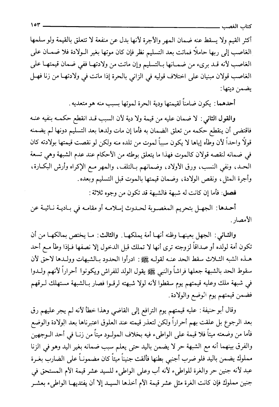 وَالثَّانِي: الْجَهْلُ بِعَيْنِهَا وَظَنُّهُ أَنَّهَا أَمَةٌ يَمْلِكُهَا. وَالثَّالِثُ: مَا يَخْتَصُّ بِمَالِكِهَا مِنْ أَنْ تَكُونَ أَمَةً لِوَلَدِهِ أَوْ صَدَاقًا لِزَوْجَتِهِ تَرَى أَنَّهَا لَا تَمْلِكُ قَبْلَ الدُّخُولِ إِلَّا نِصْفَهَا فَإِذَا وَطَأَ مَعَ أَحَدِ هَذِهِ الشُّبَهِ الثَّلَاثِ سَقَطَ الْحَدُّ عنه لقوله - صَلَّى اللَّهُ عَلَيْهِ وَسَلَّم َ -: ادرأوا الْحُدُودَ بِالشُّبُهَاتِ وَوَلَدُهَا لَاحِقٌ لِأَنَّ سُقُوطَ الْحَدِّ بِالشُّبْهَةِ جَعَلَهَا فِرَاشًا وَالنَّبِيُّ - صَلَّى اللَّهُ عَلَيْهِ وَسَلَّم َ - يقول الولد للفراش ويكونوا أَحْرَارًا لِأَنَّهُمْ وُلِدُوا فِي شُبْهَةِ مِلْكٍ وَعَلَيْهِ قِيمَتُهُمْ يَوْمَ سَقَطُوا لِأَنَّهُ لَوْلَا شُبْهَتُهُ لَرَقُّوا فصار بالشبهة مستهلك لِرِقِّهِمْ فَضَمِنَ قِيمَتَهُمْ يَوْمَ الْوَضْعِ وَالْوِلَادَةِ.