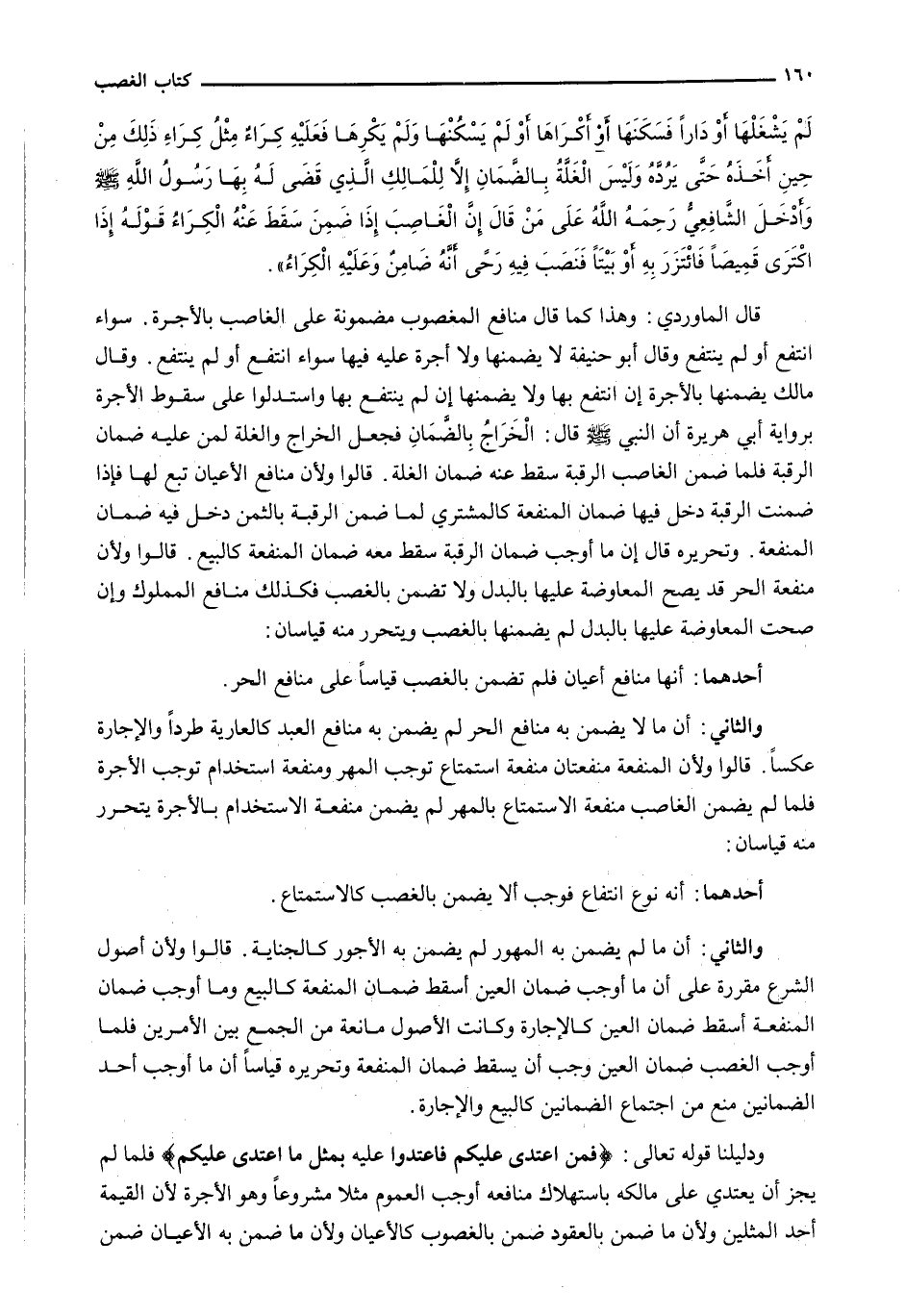 قَالَ الْمَاوَرْدِيُّ: وَهَذَا كَمَا قَالَ مَنَافِعُ الْمَغْصُوبِ مَضْمُونَةٌ عَلَى الْغَاصِبِ بِالْأُجْرَةِ. سَوَاءٌ انْتَفَعَ أَوْ لَمْ يَنْتَفِعْ وَقَالَ أبو حنيفة لَا يَضْمَنُهَا وَلَا أُجْرَةَ عَلَيْهِ فِيهَا سَوَاءٌ انْتَفَعَ أَوْ لَمْ يَنْتَفِعْ. وَقَالَ مَالِكٌ يَضْمَنُهَا بِالْأُجْرَةِ إِنِ انْتَفَعَ بِهَا وَلَا يَضْمَنُهَا إِنْ لَمْ يَنْتَفِعْ بِهَا وَاسْتَدَلُّوا عَلَى سُقُوطِ الْأُجْرَةِ بِرِوَايَةِ أَبِي هُرَيْرَةَ أَنَّ النَّبِيَّ - صَلَّى اللَّهُ عَلَيْهِ وَسَلَّم َ - قَالَ: الْخَرَاجُ بِالضَّمَانِ فَجَعَلَ الْخَرَاجَ وَالْغَلَّةَ لِمَنْ عَلَيْهِ ضَمَانُ الرَّقَبَةِ فَلَمَّا ضَمِنَ الْغَاصِبُ الرَّقَبَةَ سقط عنه ضمان الغلة. قالوا ولأن مَنَافِعَ الْأَعْيَانِ تَبَعٌ لَهَا فَإِذَا ضُمِنَتِ الرَّقَبَةُ دَخَلَ فِيهَا ضَمَانُ الْمَنْفَعَةِ كَالْمُشْتَرِي لَمَّا ضَمِنَ الرَّقَبَةَ بِالثَّمَنِ دَخَلَ فِيهِ ضَمَانُ الْمَنْفَعَةِ. وَتَحْرِيرُهُ قَالَ إِنَّ مَا أَوْجَبَ ضَمَانَ الرَّقَبَةِ سَقَطَ مَعَهُ ضَمَانُ الْمَنْفَعَةِ كَالْبَيْعِ. قَالُوا وَلِأَنَّ مَنْفَعَةَ الْحُرِّ قَدْ يَصِحُّ الْمُعَاوَضَةُ عَلَيْهَا بِالْبَدَلِ وَلَا تُضْمَنُ بِالْغَصْبِ فَكَذَلِكَ مَنَافِعُ الْمَمْلُوكِ وَإِنْ صَحَّتِ الْمُعَاوَضَةُ عَلَيْهَا بِالْبَدَلِ لَمْ يَضْمَنْهَا بِالْغَصْبِ وَيَتَحَرَّرُ مِنْهُ قِيَاسَانِ:
