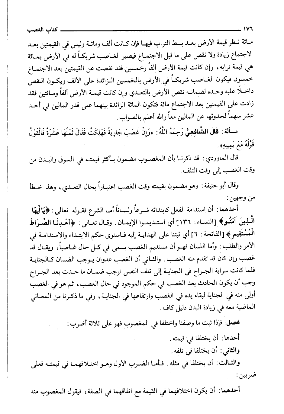 أَحَدُهُمَا: أَنَّ اسْتِدَامَةَ الْفِعْلِ كَابْتِدَائِهِ شَرْعًا وَلِسَانًا أَمَّا الشَّرْعُ فَقَوْلُهُ تَعَالَى: {يَا أيُّهَا الَّذِينَ آمَنُوا) {النساء: 136) أَيِ اسْتَدِيمُوا الْإِيمَانَ. وَقَالَ تَعَالَى: {اهْدِنَا الصِّرَاطَ الْمُسْتَقِيمِ) {الفاتحة: 6) أَيْ ثَبِّتْنَا عَلَى الْهِدَايَةِ إِلَيْهِ فَاسْتَوَى حُكْمُ الِابْتِدَاءِ وَالِاسْتِدَامَةِ فِي الْأَمْرِ وَالطَّلَبِ: وَأَمَّا اللِّسَانُ فَهُوَ أَنَّ مُسْتَدِيمَ الْغَصْبِ يُسَمَّى فِي كُلِّ حَالٍ غَاصِبًا، وَيُقَالُ قَدْ غَصَبَ وَإِنْ كَانَ قَدْ تَقَدَّمَ مِنْهُ الْغَصْبُ. وَالثَّانِي أَنَّ الْغَصْبَ عُدْوَانٌ يُوجِبُ الضَّمَانَ كَالْجِنَايَةِ فَلَمَّا كَانَتْ سَرَايَةُ الْجِرَاحِ فِي الْجِنَايَةِ إِلَى تَلَفِ النَّفْسِ تُوجِبُ ضَمَانَ مَا حَدَثَ بَعْدَ الْجِرَاحِ وَجَبَ أَنْ يَكُونَ الْحَادِثُ بَعْدَ الْغَصْبِ فِي حُكْمِ الْمَوْجُودِ فِي حَالِ الْغَصْبِ، ثُمَّ هُوَ فِي الْغَصْبِ أَوْلَى مِنْهُ فِي الْجِنَايَةِ لِبَقَاءِ يَدِهِ فِي الْغَصْبِ وَارْتِفَاعِهَا فِي الْجِنَايَةِ، وَفِي مَا ذَكَرْنَا مِنَ الْمَعَانِي الْمَاضِيَةِ مَعَهُ فِي زِيَادَةِ الْبَدَنِ دَلِيلٌ كَافٍ.