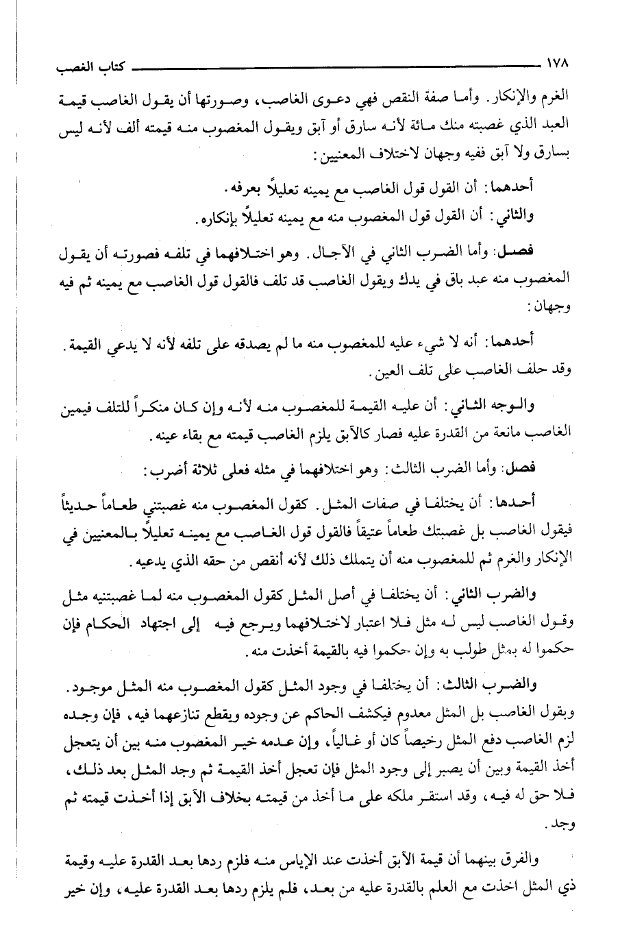 الْغُرْمُ وَالْإِنْكَارُ. وَأَمَّا صِفَةُ النَّقْصِ فَهِيَ دَعْوَى الْغَاصِبِ، وَصُورَتُهَا أَنْ يَقُولَ الْغَاصِبُ قِيمَةُ الْعَبْدِ الَّذِي غَصَبْتُهُ مِنْكَ مِائَةٌ لِأَنَّهُ سَارِقٌ أَوْ آبِقٌ وَيَقُولُ الْمَغْصُوبُ مِنْهُ قِيمَتُهُ أَلْفٌ لِأَنَّهُ لَيْسَ بِسَارِقٍ وَلَا آبِقٍ فَفِيهِ وَجْهَانِ لِاخْتِلَافِ الْمَعْنَيَيْنِ: