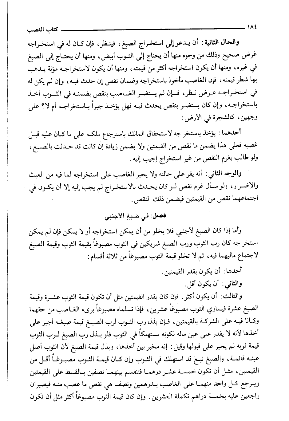 وَأَمَّا إِذَا كَانَ الصَّبْغُ لِأَجْنَبِيٍّ فَلَا يَخْلُو مِنْ أَنْ يُمْكِنَ اسْتِخْرَاجُهُ أَوْ لَا يُمْكِنُ فَإِنْ لَمْ يُمْكِنِ اسْتِخْرَاجُهُ كَانَ رَبُّ الثَّوْبِ وَرَبُّ الصَّبْغِ شَرِيكَيْنِ فِي الثَّوْبِ مَصْبُوغًا بِقِيمَةِ الثوب وقيمة الصبغ لاجتماع ماليهما فِيهِ، ثُمَّ لَا تَخْلُو قِيمَةُ الثَّوْبِ مَصْبُوغًا مِنْ ثَلَاثَةِ أَقْسَامٍ: